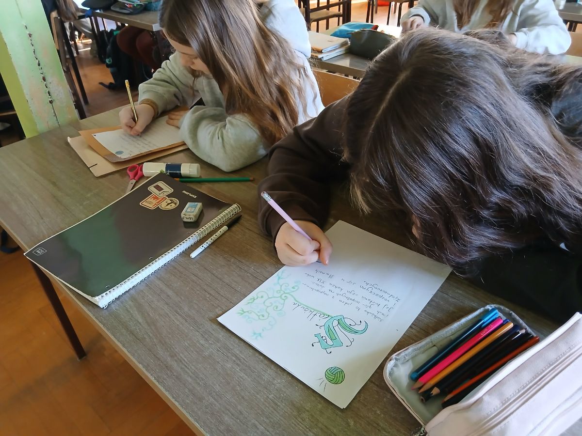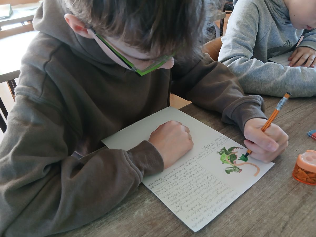 Uczniowie klas 5a i 5b stworzyli inicjały inspirowane średniowiecznymi manuskryptami. Każdy z nich przedstawiał pierwszą literę wybranego tekstu, najczęściej związanego z zainteresowaniami uczniów. Litery zostały ozdobione ilustracjami, symbolami oraz roślinnymi i zwierzęcymi ornamentami, nawiązującymi do treści tekstu – zupełnie jak w dawnych iluminowanych księgach.