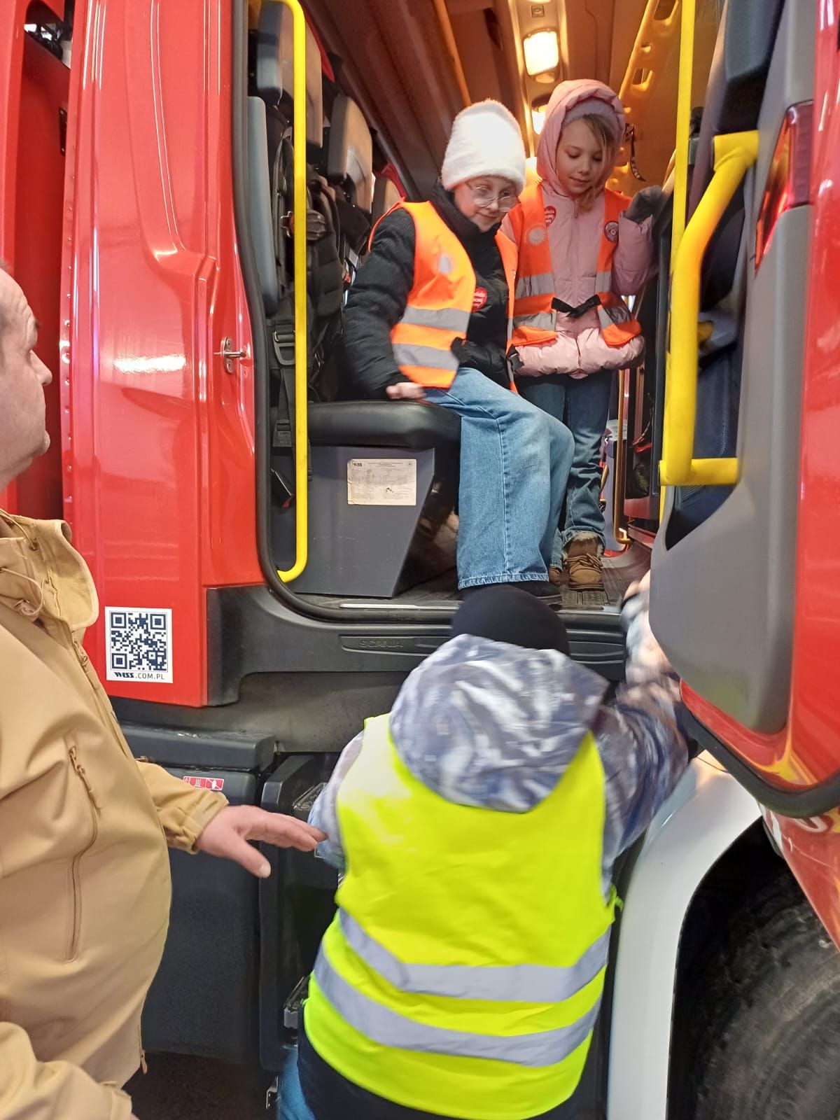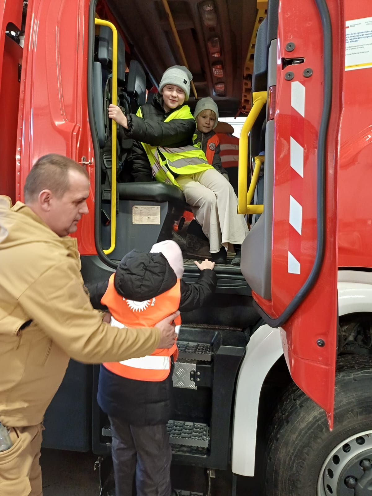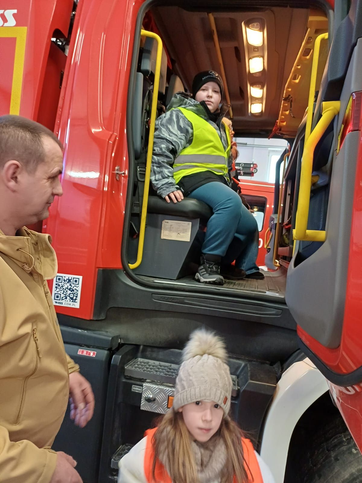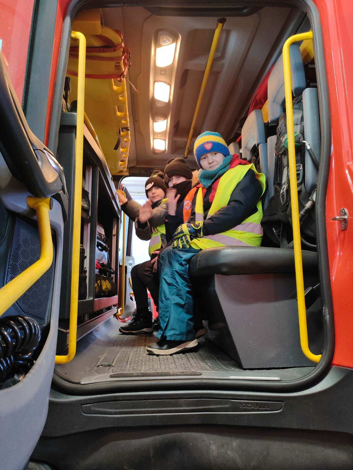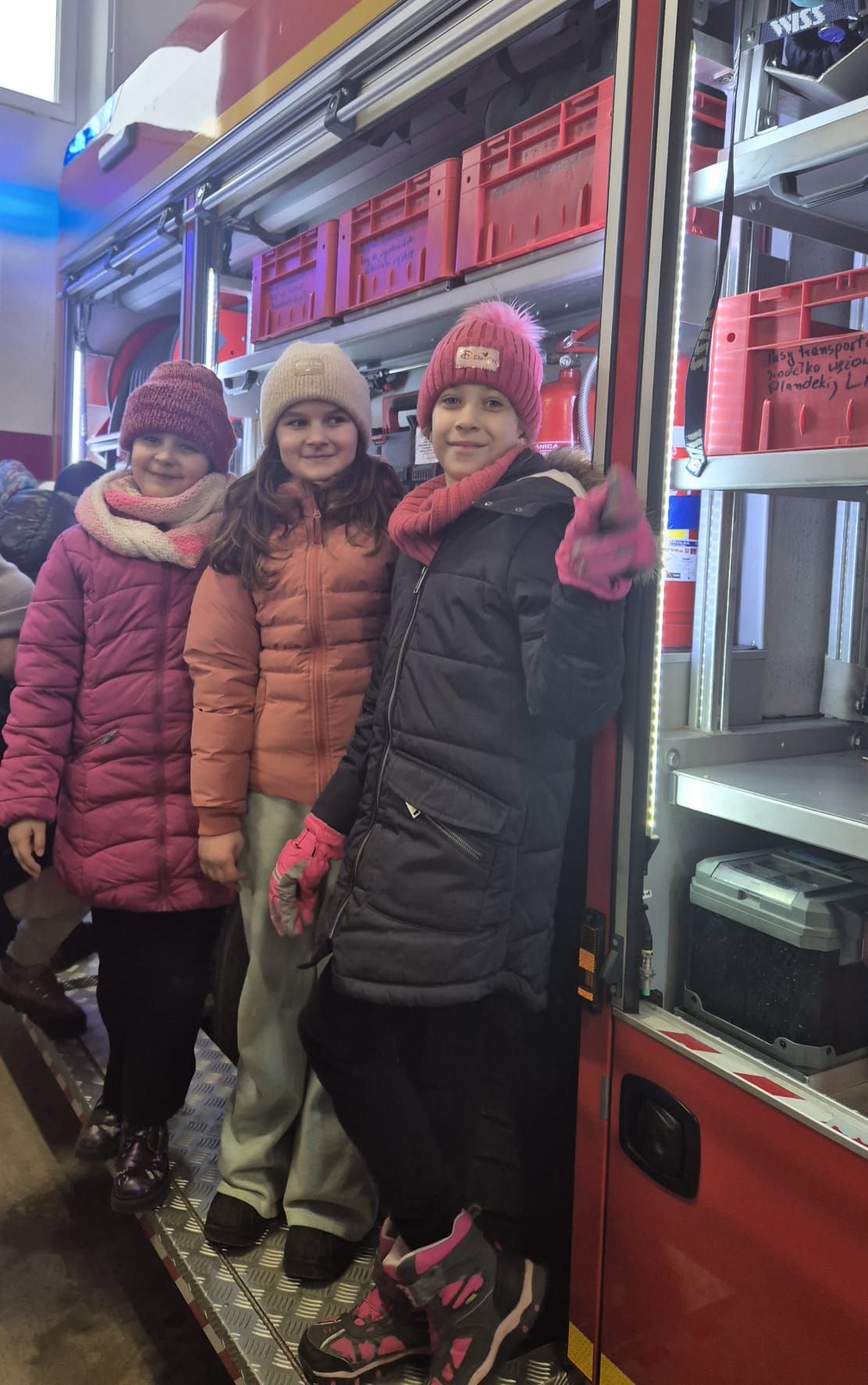 Uczniowie klas 1–3 odwiedzili straż pożarną, aby dowiedzieć się, jak bezpiecznie spędzić ferie zimowe.