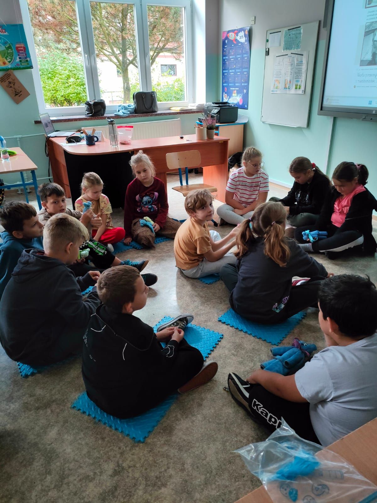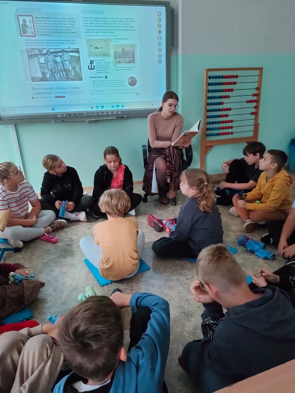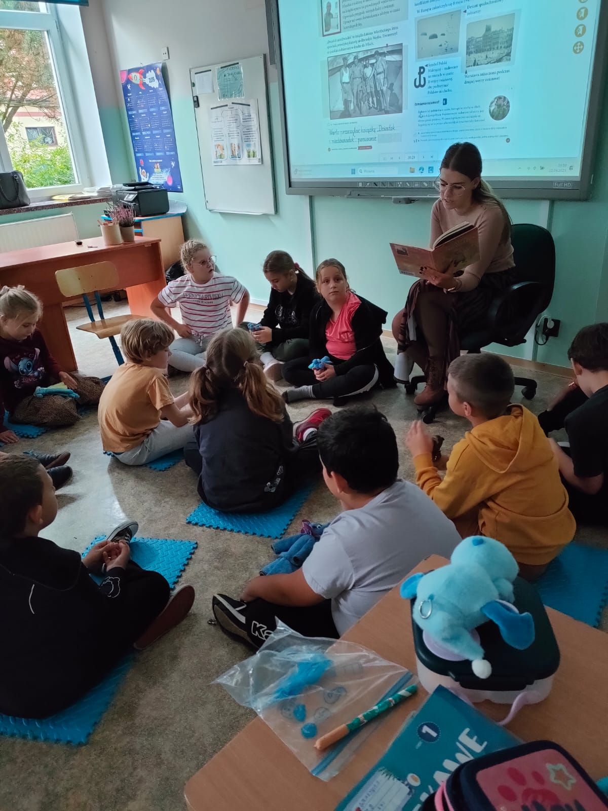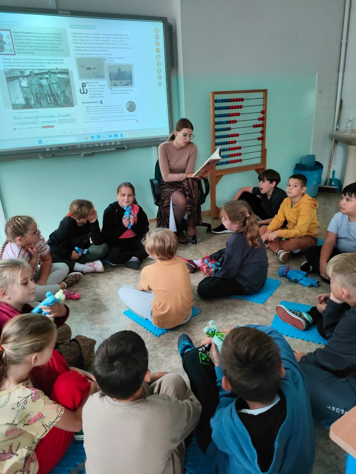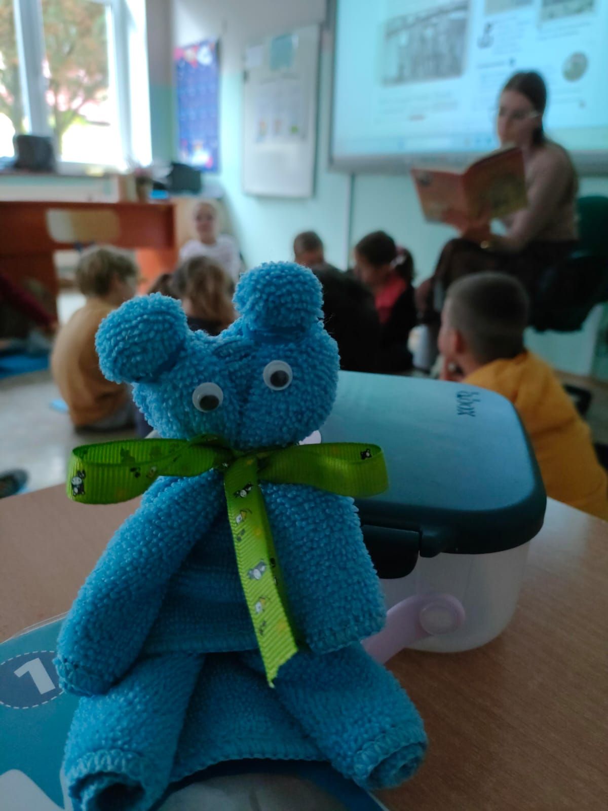 Uczniowie z wielkim zainteresowaniem słuchali historii o dalszych losach i przygodach niedźwiadka Wojtka. Dzieci w podziękowaniu za piękne czytanie, wynagrodziły panią Magdę przygotowaną niedźwiadkową maskotką.