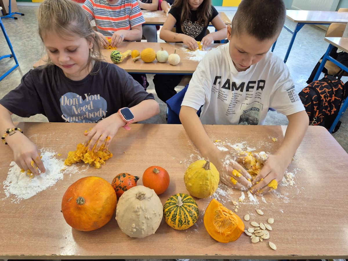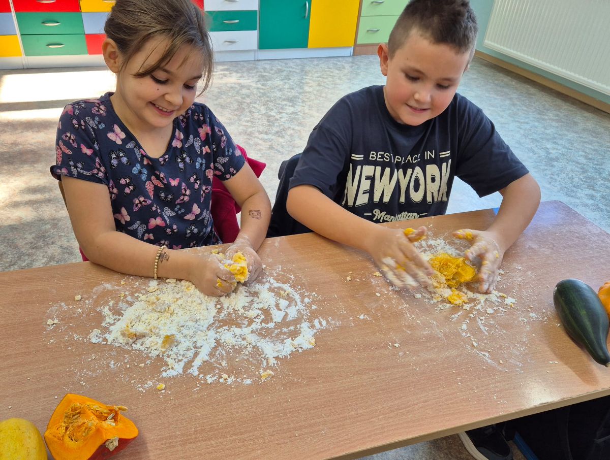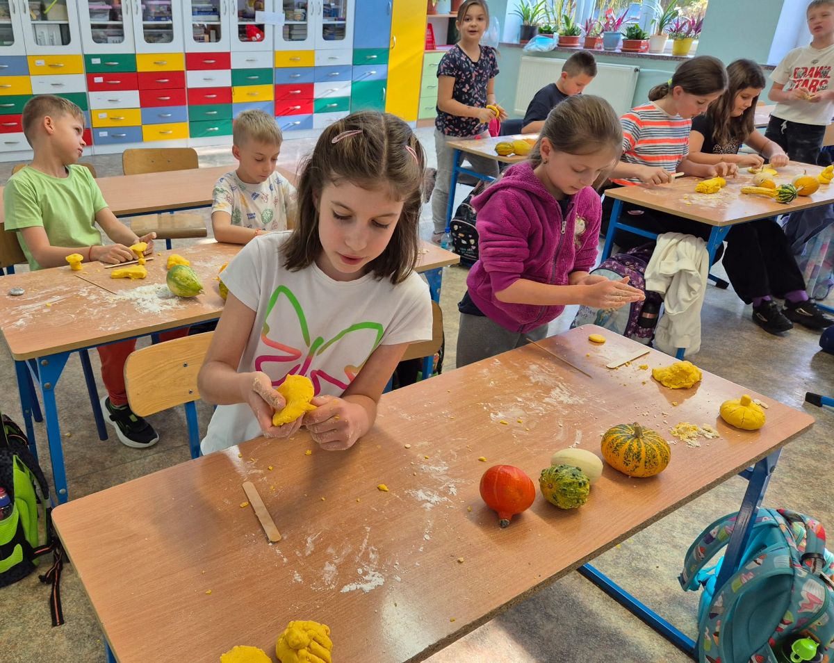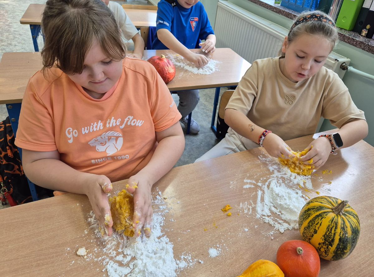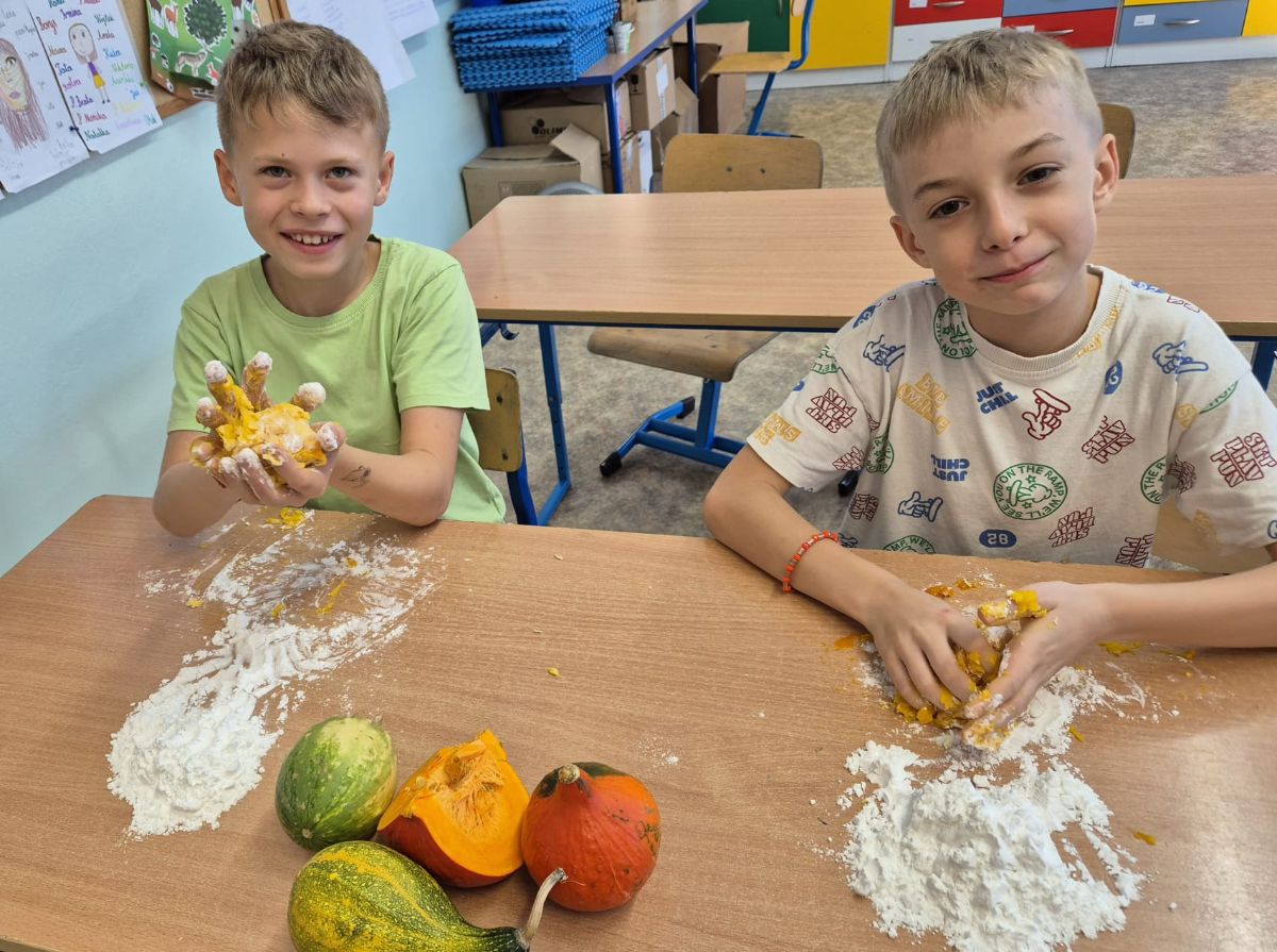 W klasie 3a i 1b jesień zawitała na dobre! Dzieci przygotowały pachnącą masę sensoryczną z dyni, którą mogły ugniatać, mieszać i formować według własnych pomysłów.