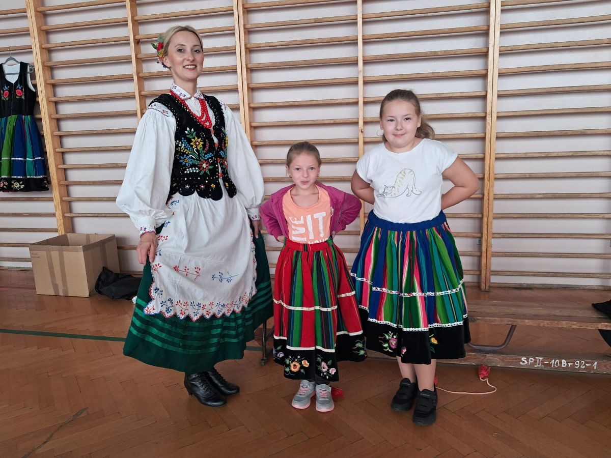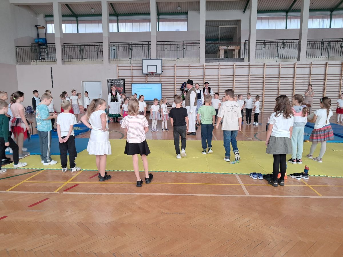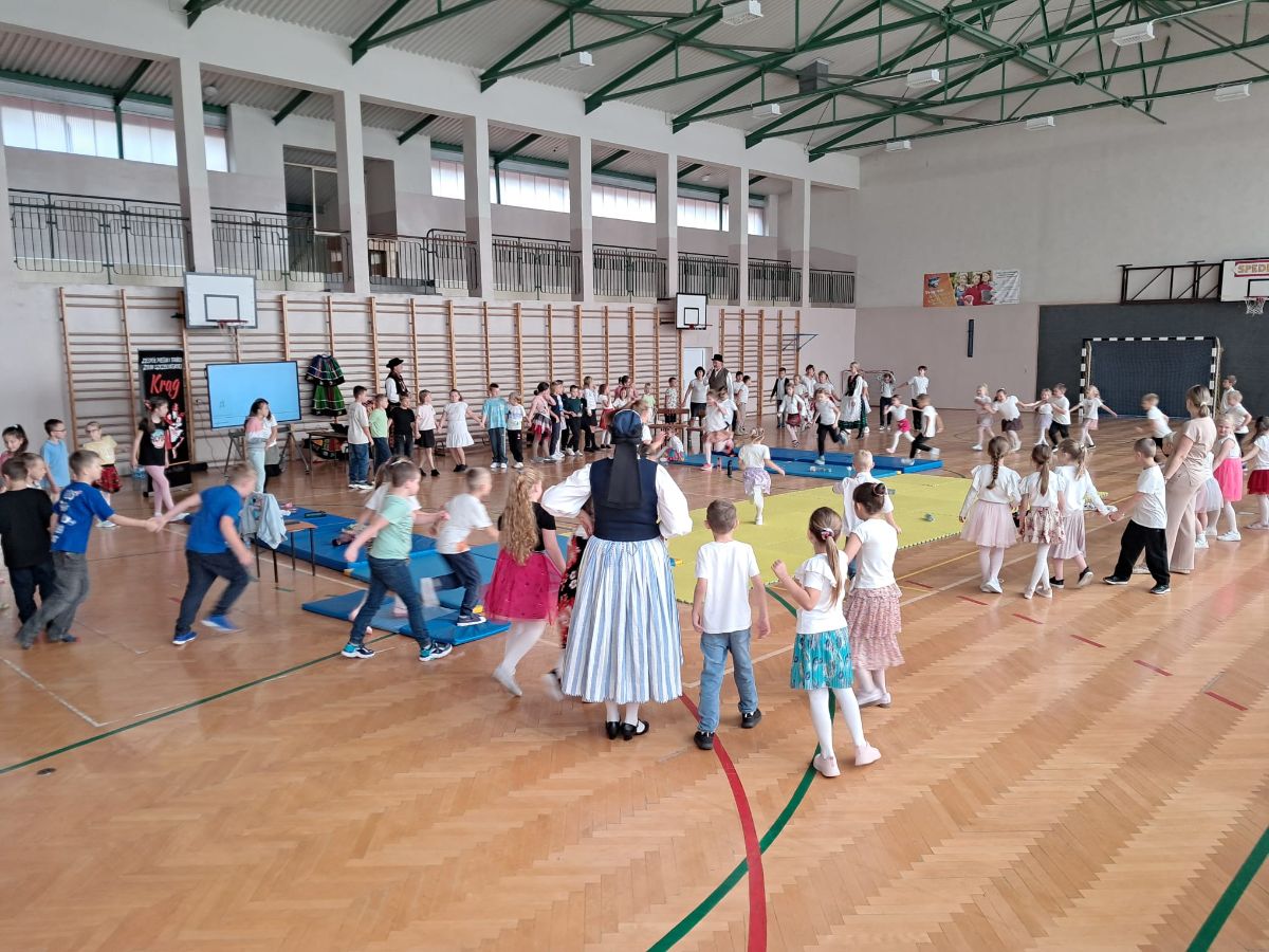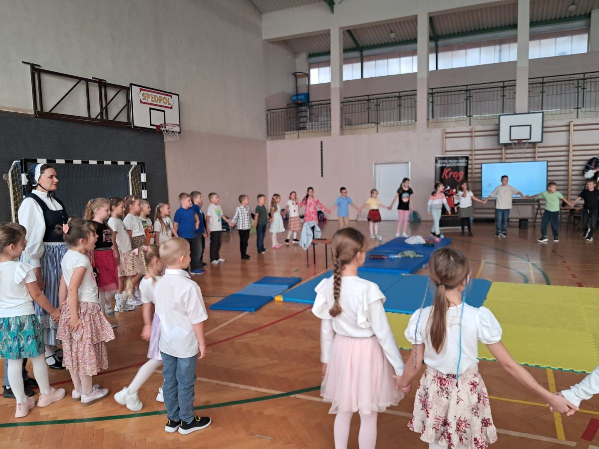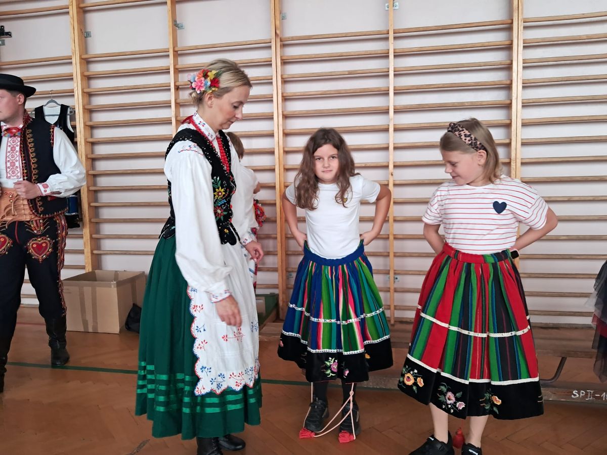 Uczniowie klas młodszych poznali regionalne stroje ludowe i historię ziem, które obecnie zamieszkujemy. "Koseder" to taniec, którego kroki dzieci próbowały zatańczyć. Przymierzały elementy strojów - wianki, zapaski, czapki oraz obserwowały fragmenty tańców polskich w wykonaniu członków zespołu.