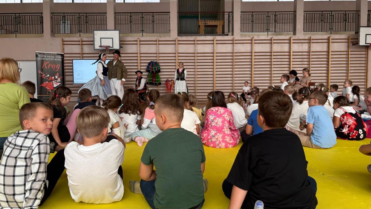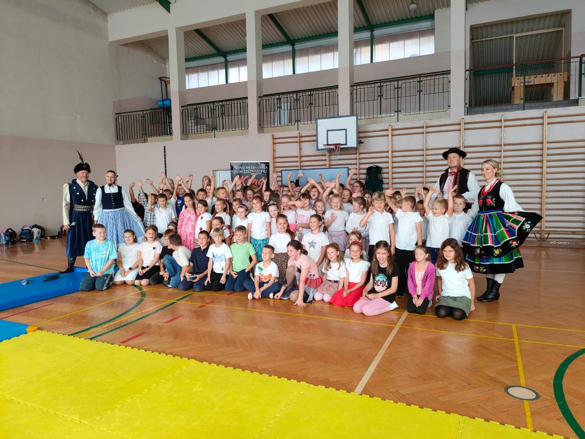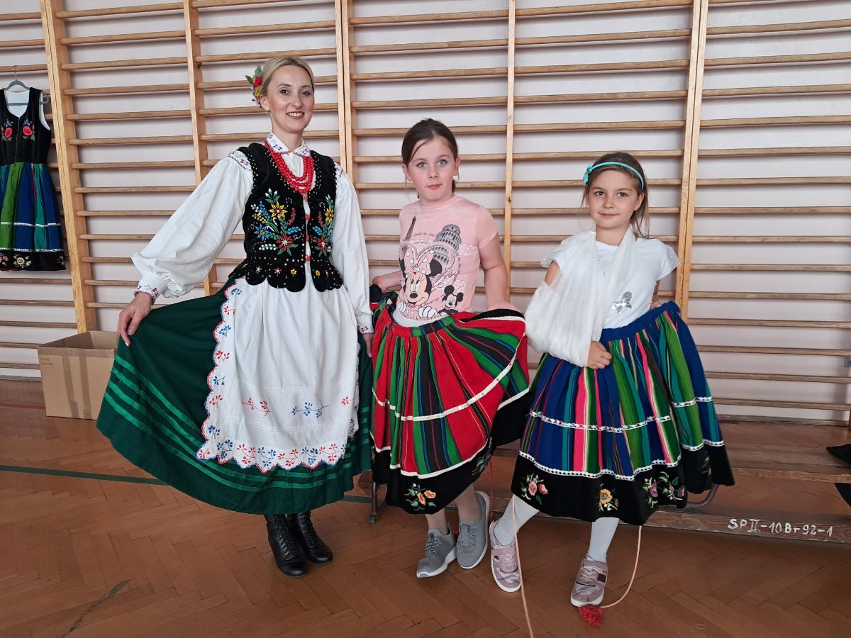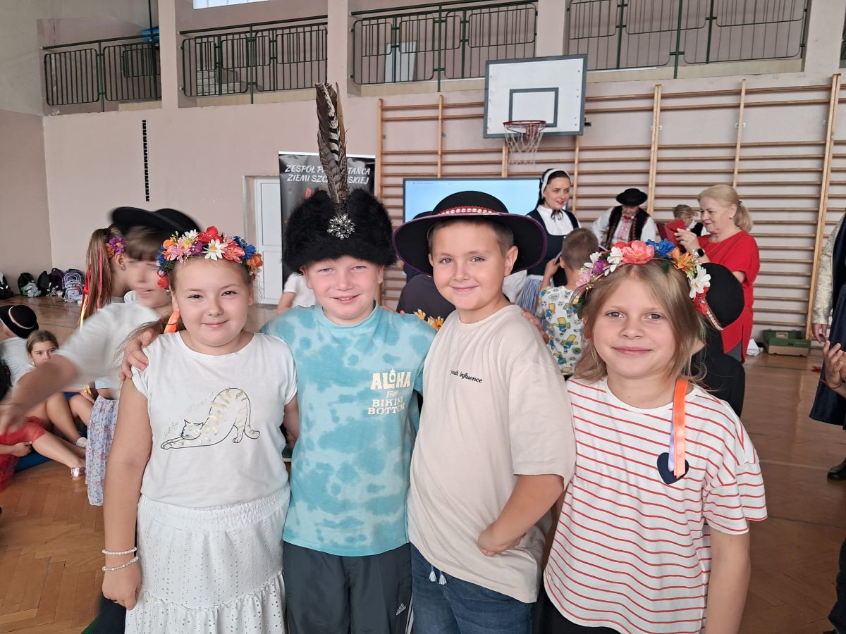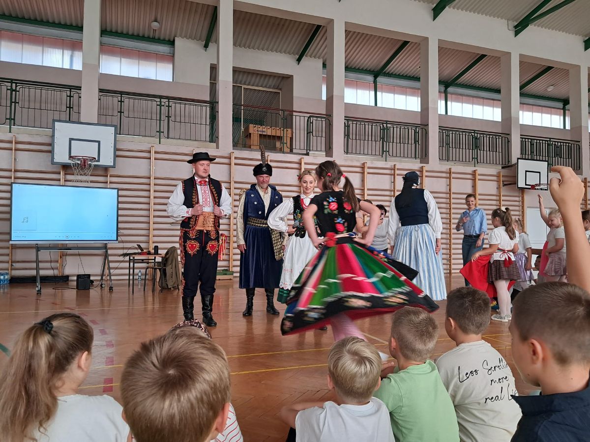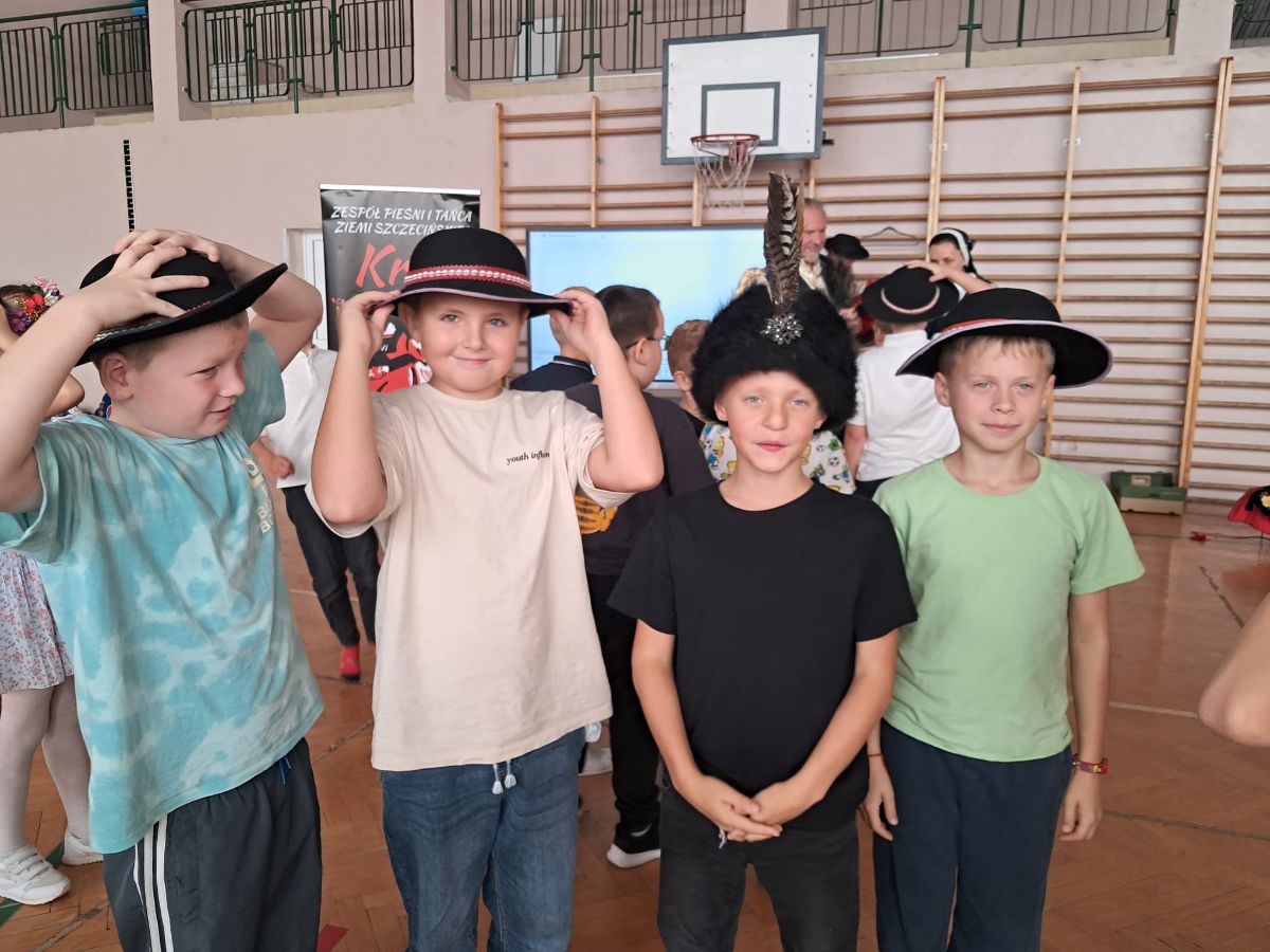 Uczniowie klas młodszych poznali regionalne stroje ludowe i historię ziem, które obecnie zamieszkujemy. "Koseder" to taniec, którego kroki dzieci próbowały zatańczyć. Przymierzały elementy strojów - wianki, zapaski, czapki oraz obserwowały fragmenty tańców polskich w wykonaniu członków zespołu.