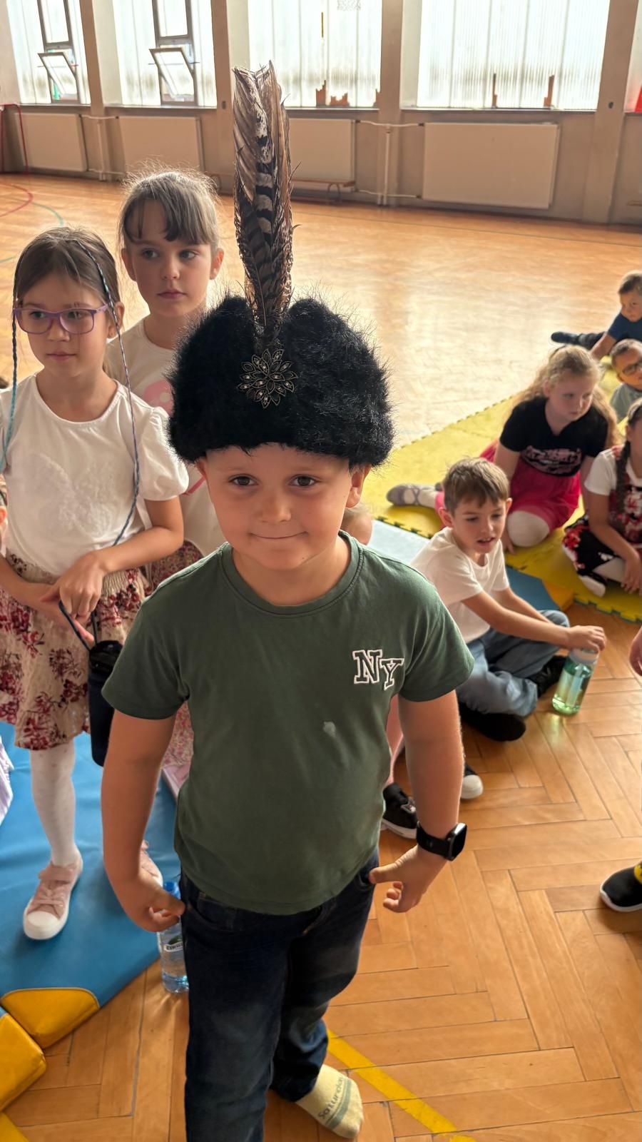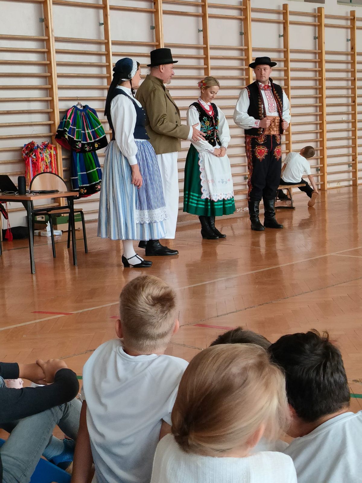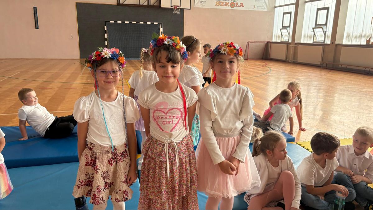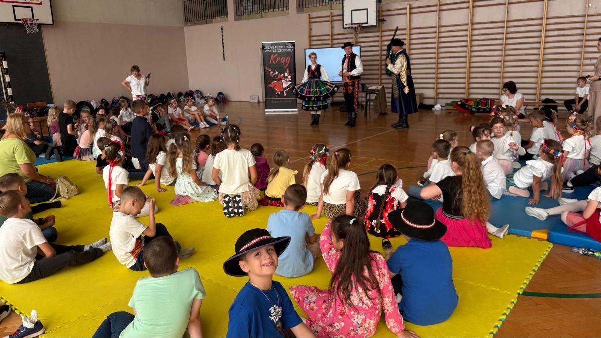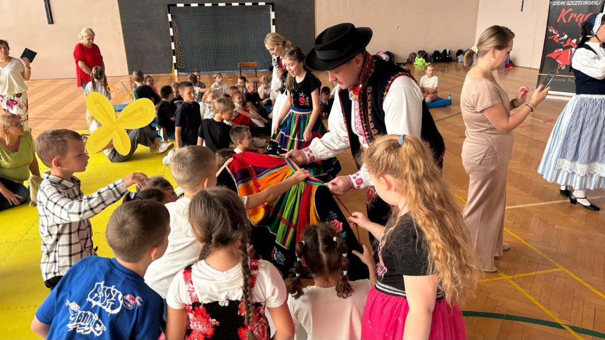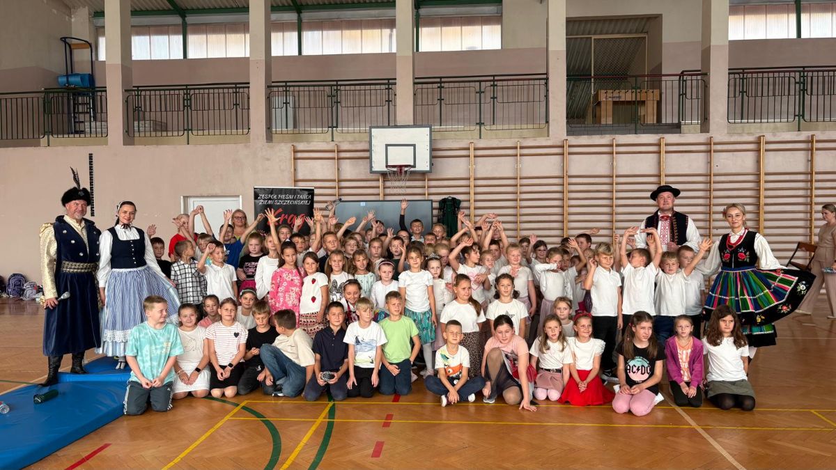Uczniowie klas młodszych poznali regionalne stroje ludowe i historię ziem, które obecnie zamieszkujemy. "Koseder" to taniec, którego kroki dzieci próbowały zatańczyć. Przymierzały elementy strojów - wianki, zapaski, czapki oraz obserwowały fragmenty tańców polskich w wykonaniu członków zespołu.