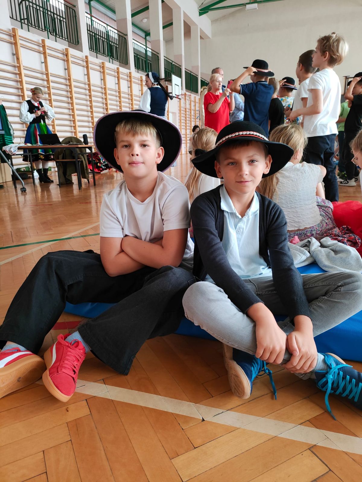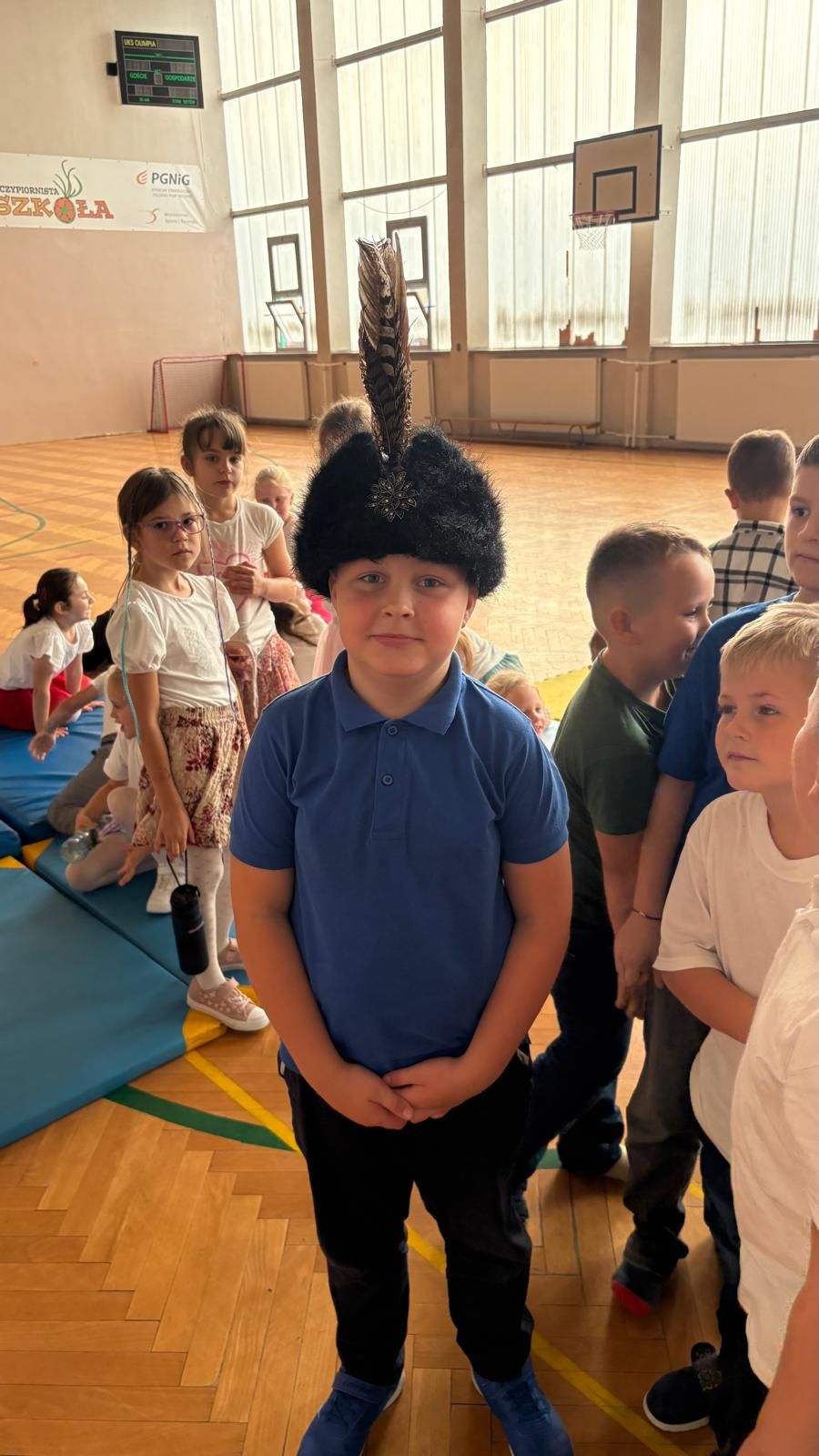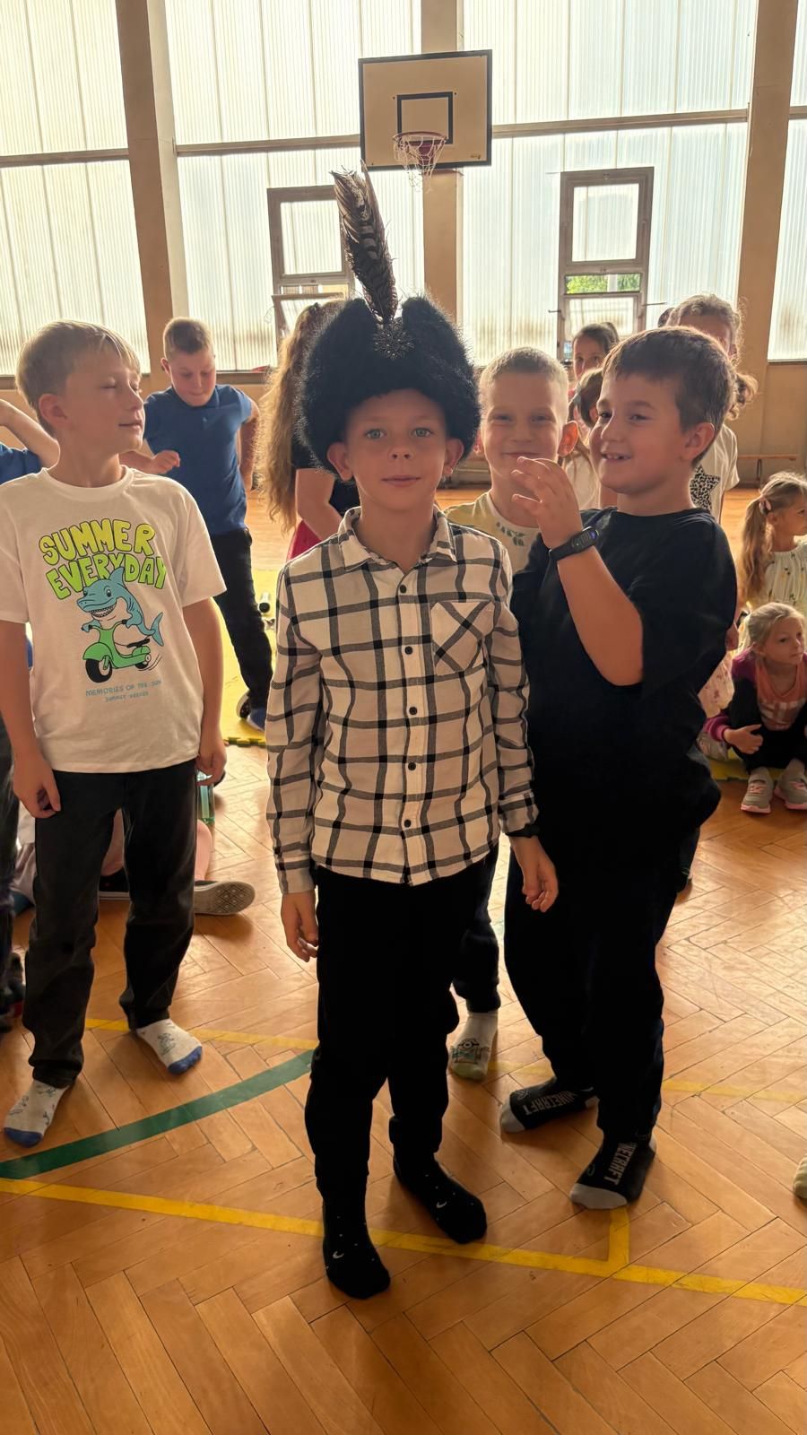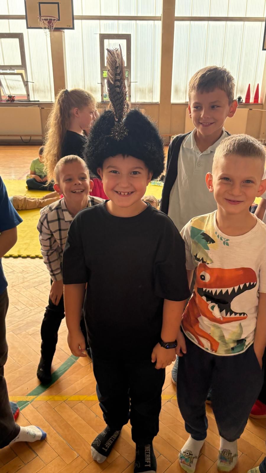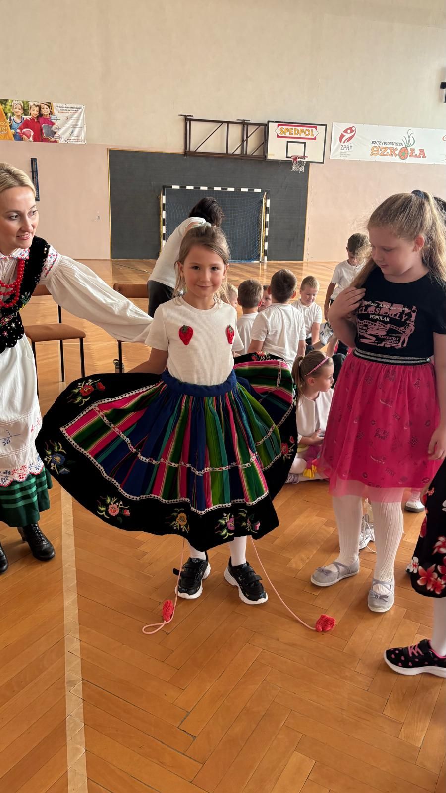Uczniowie klas młodszych poznali regionalne stroje ludowe i historię ziem, które obecnie zamieszkujemy. "Koseder" to taniec, którego kroki dzieci próbowały zatańczyć. Przymierzały elementy strojów - wianki, zapaski, czapki oraz obserwowały fragmenty tańców polskich w wykonaniu członków zespołu.