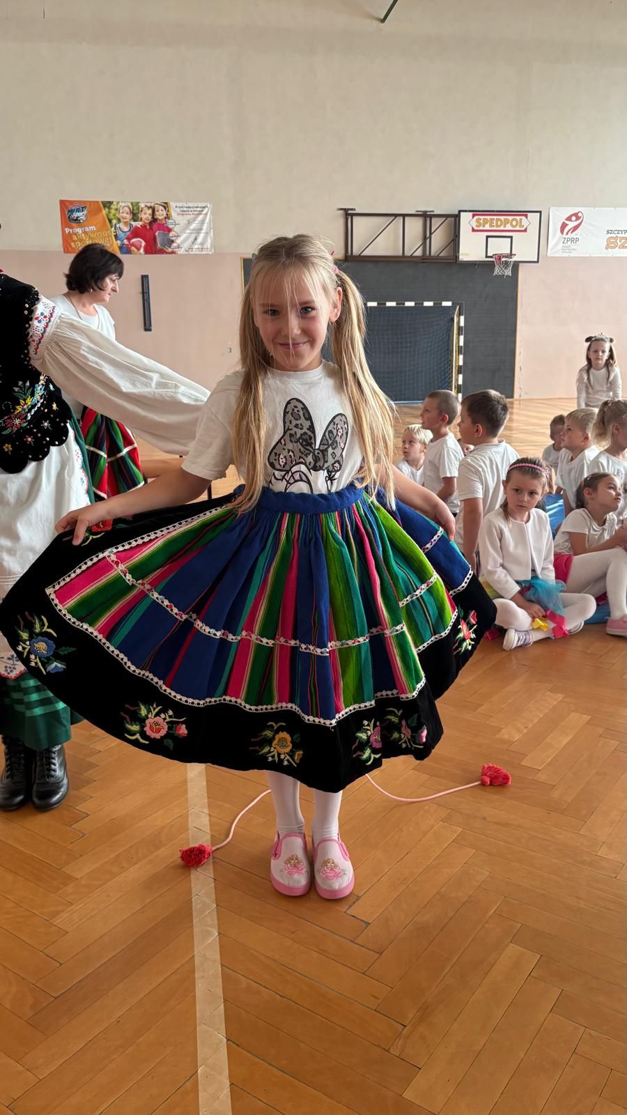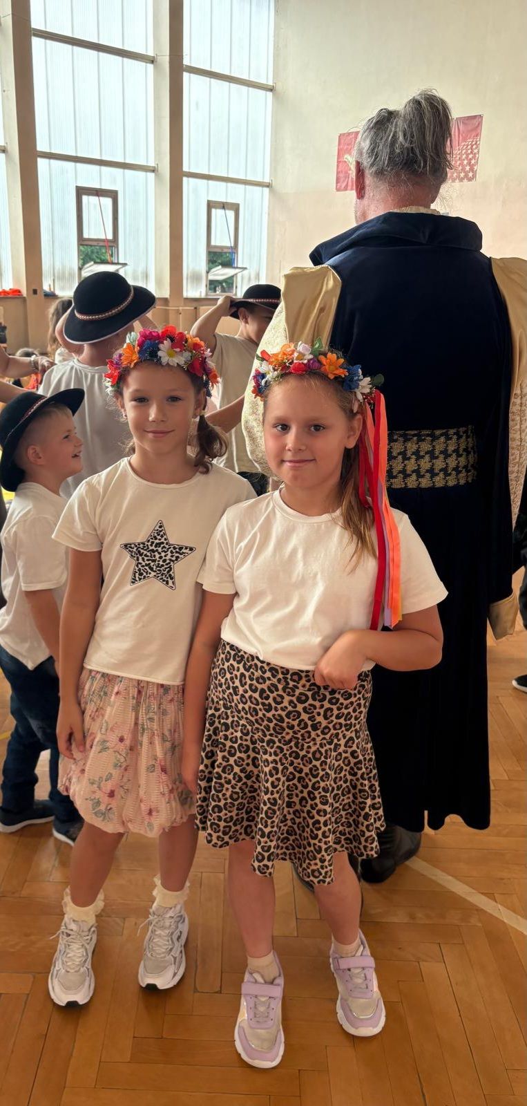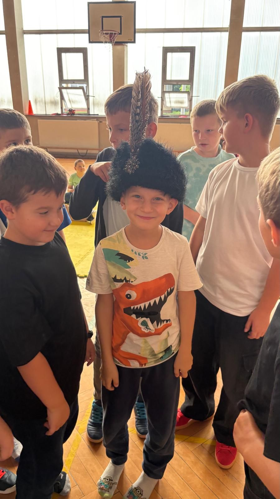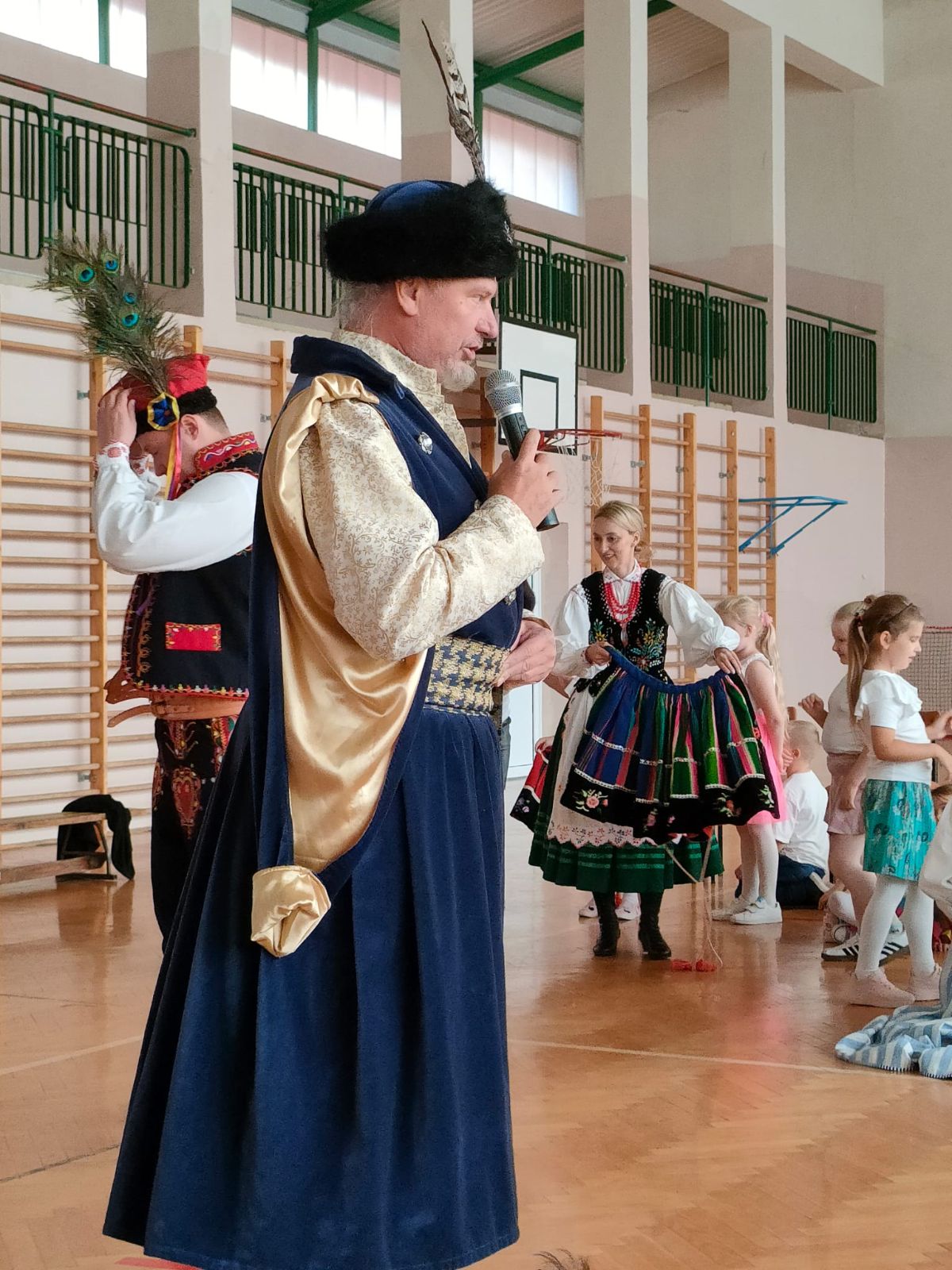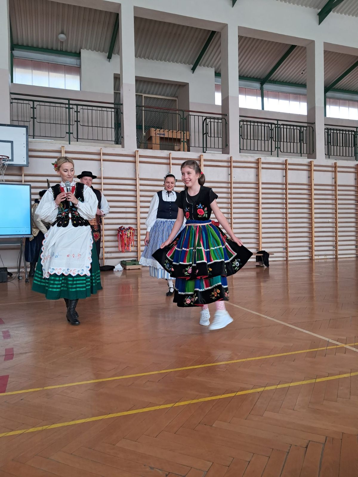 Uczniowie klas młodszych poznali regionalne stroje ludowe i historię ziem, które obecnie zamieszkujemy. "Koseder" to taniec, którego kroki dzieci próbowały zatańczyć. Przymierzały elementy strojów - wianki, zapaski, czapki oraz obserwowały fragmenty tańców polskich w wykonaniu członków zespołu.