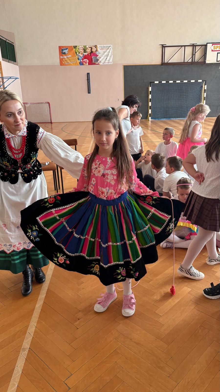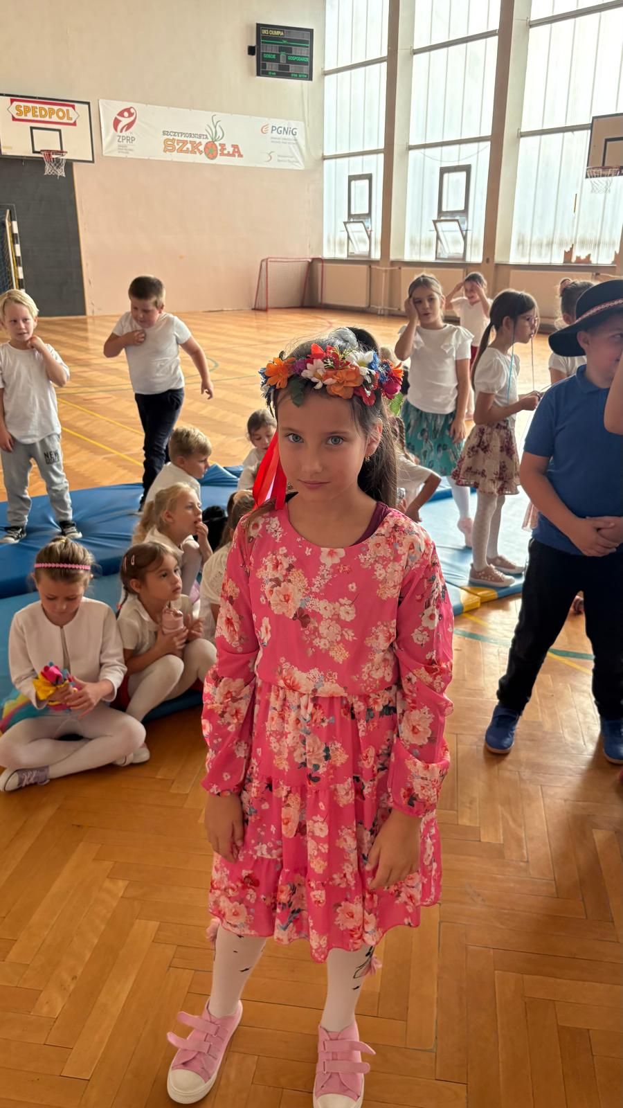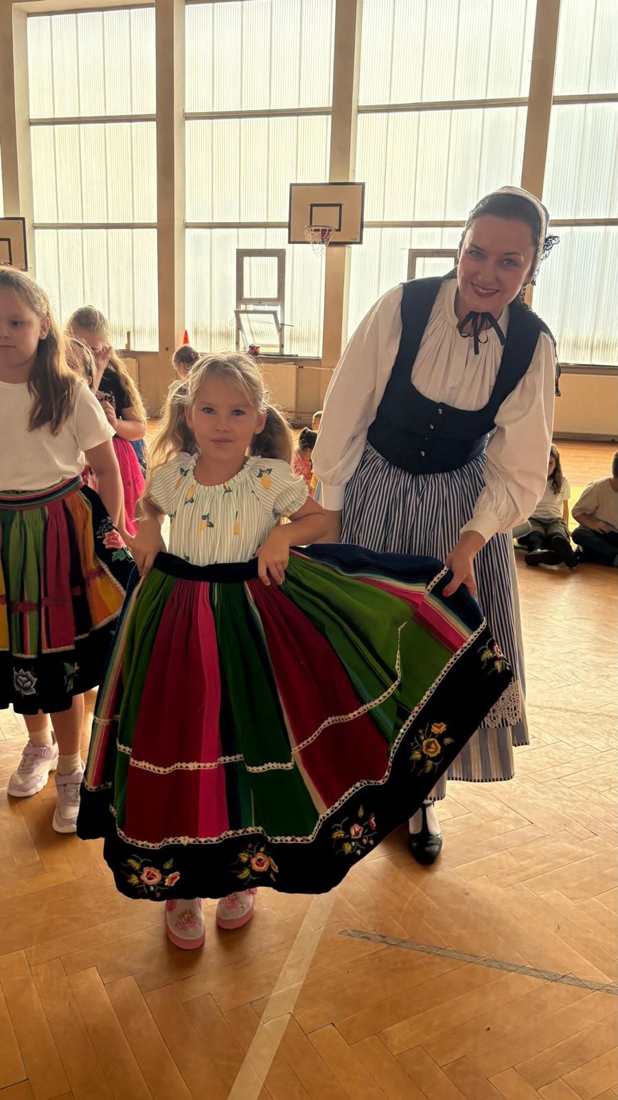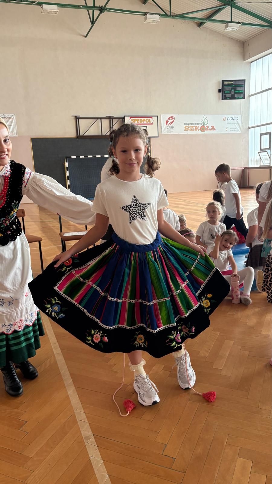 Uczniowie klas młodszych poznali regionalne stroje ludowe i historię ziem, które obecnie zamieszkujemy. "Koseder" to taniec, którego kroki dzieci próbowały zatańczyć. Przymierzały elementy strojów - wianki, zapaski, czapki oraz obserwowały fragmenty tańców polskich w wykonaniu członków zespołu.