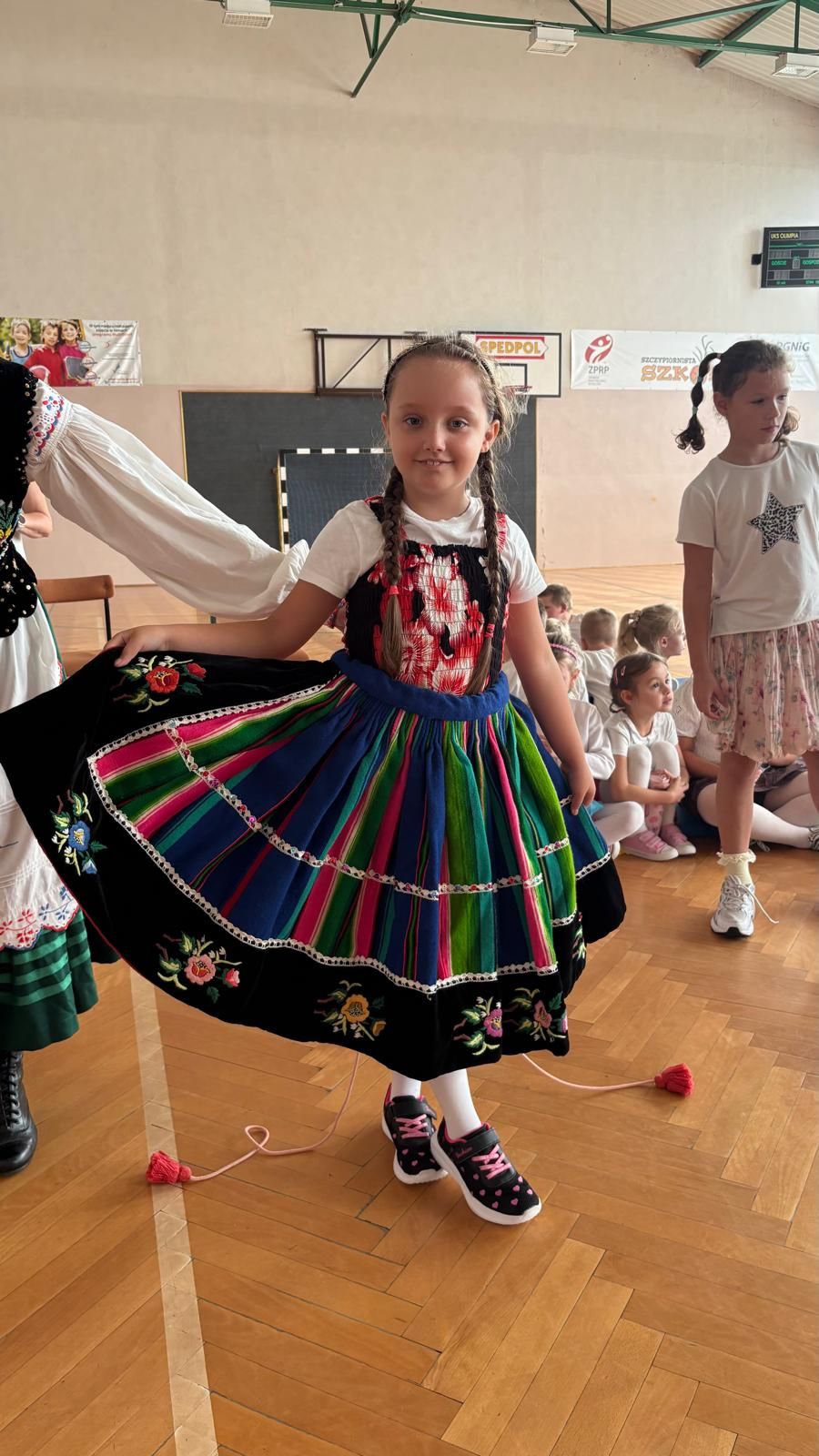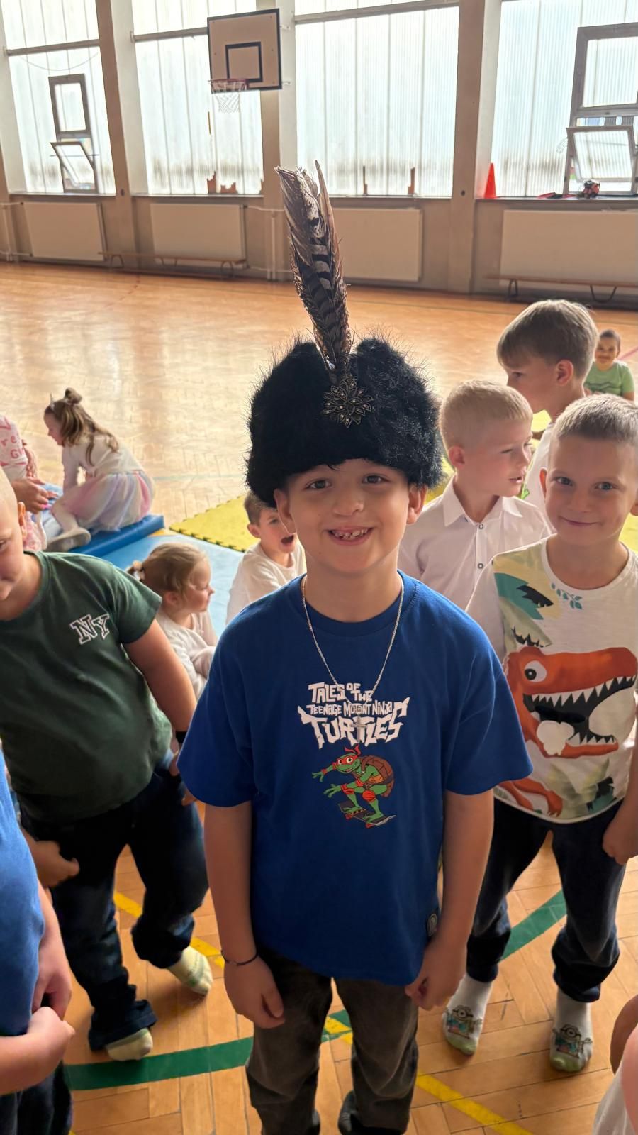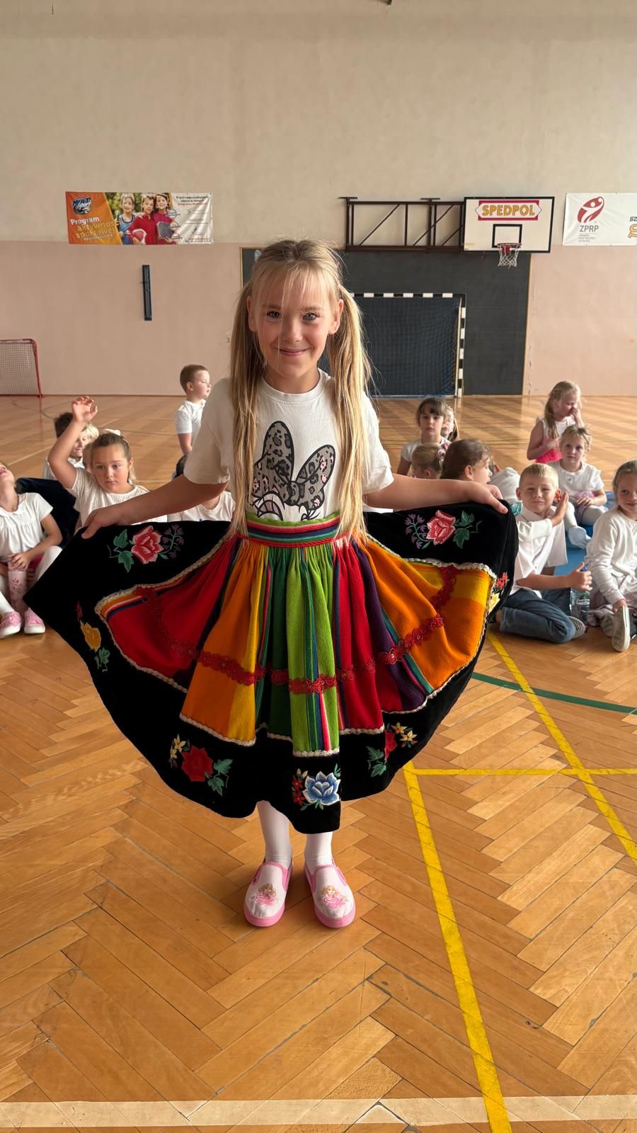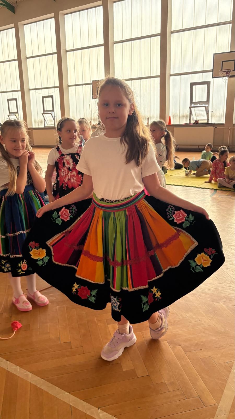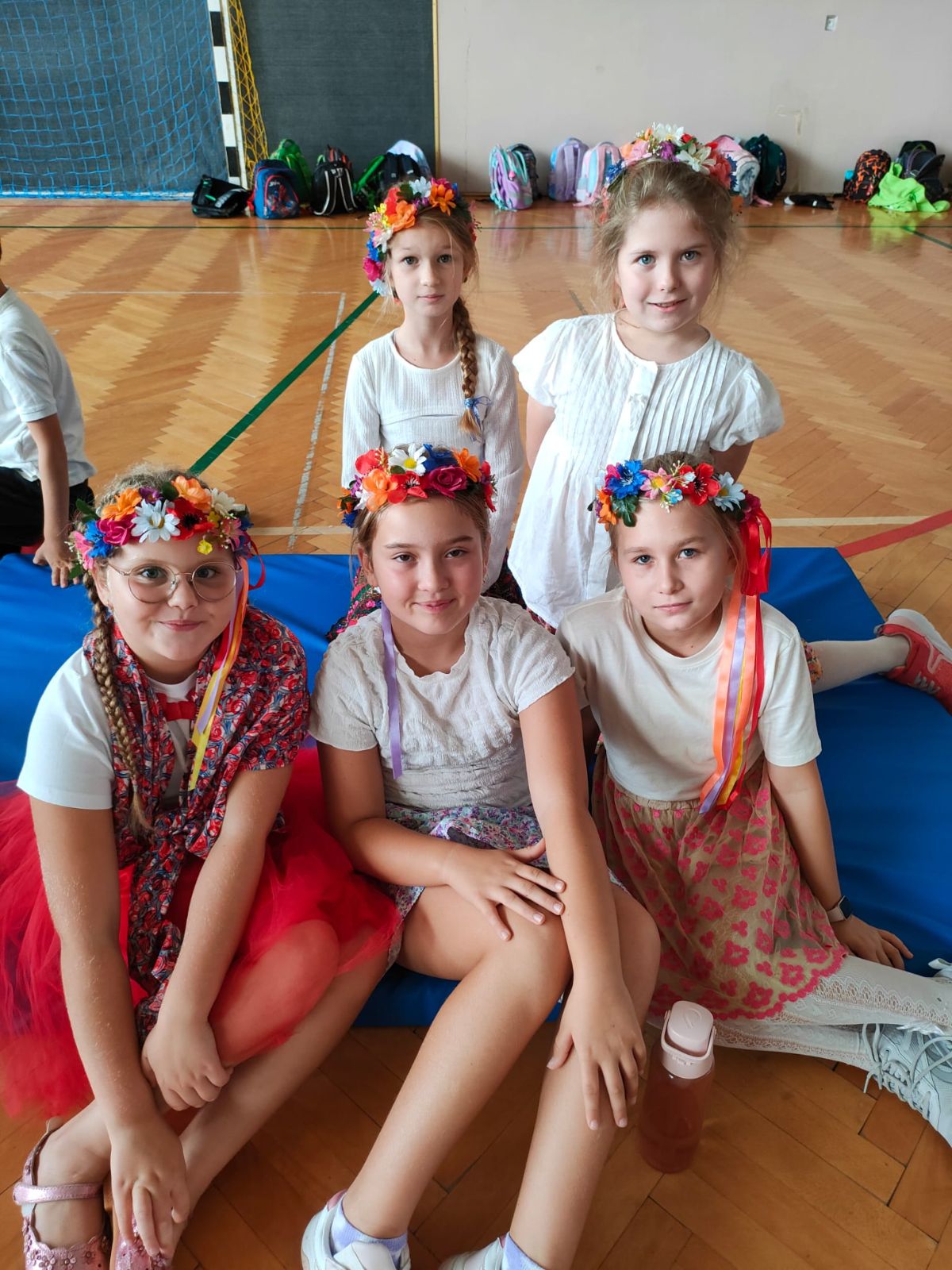 Uczniowie klas młodszych poznali regionalne stroje ludowe i historię ziem, które obecnie zamieszkujemy. "Koseder" to taniec, którego kroki dzieci próbowały zatańczyć. Przymierzały elementy strojów - wianki, zapaski, czapki oraz obserwowały fragmenty tańców polskich w wykonaniu członków zespołu.