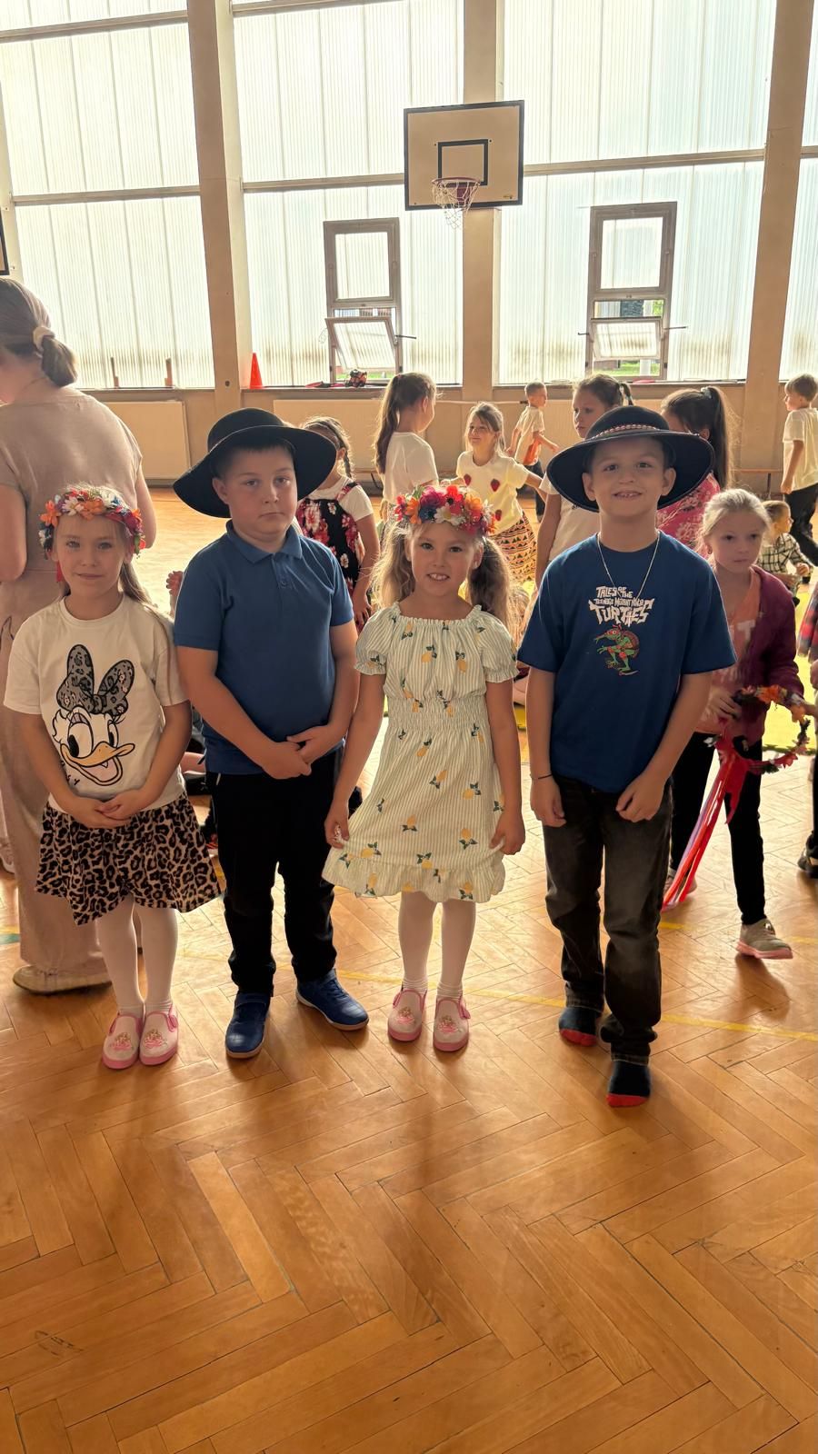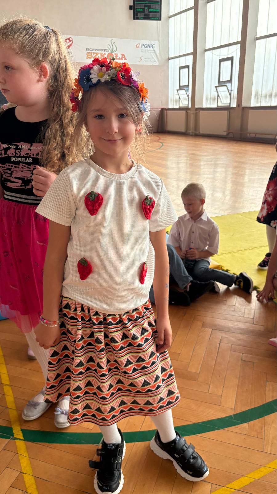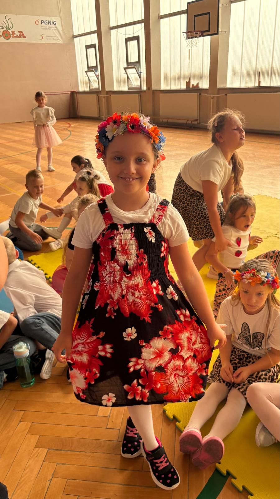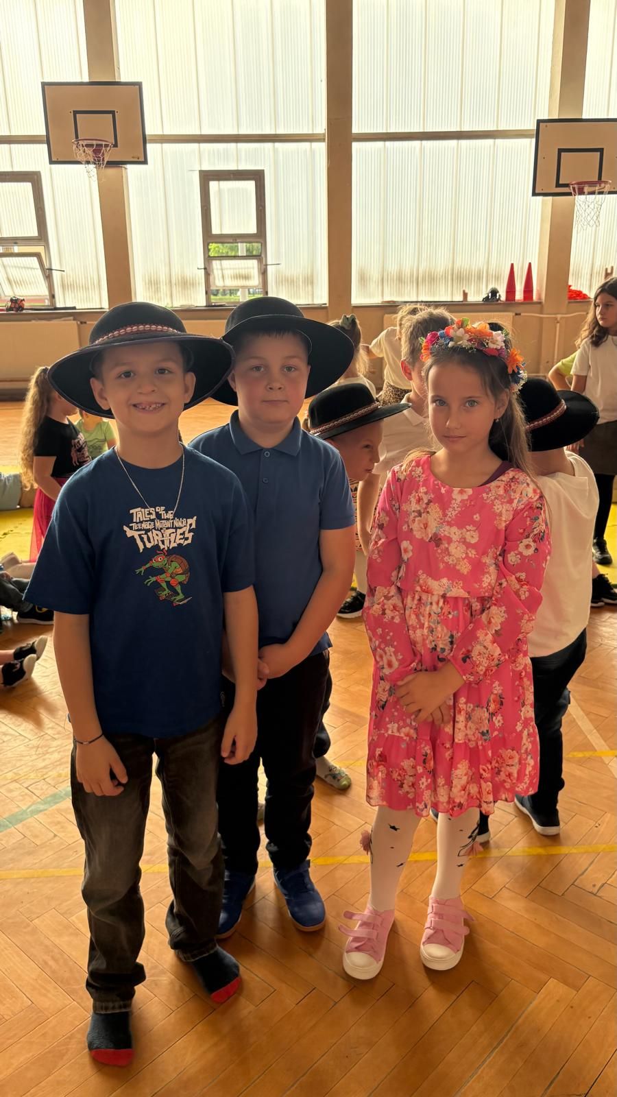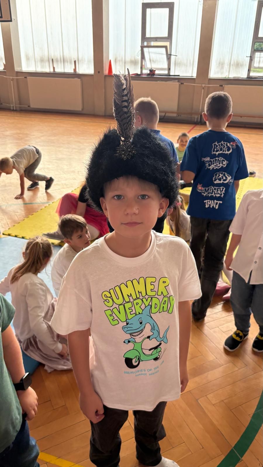 Uczniowie klas młodszych poznali regionalne stroje ludowe i historię ziem, które obecnie zamieszkujemy. "Koseder" to taniec, którego kroki dzieci próbowały zatańczyć. Przymierzały elementy strojów - wianki, zapaski, czapki oraz obserwowały fragmenty tańców polskich w wykonaniu członków zespołu.