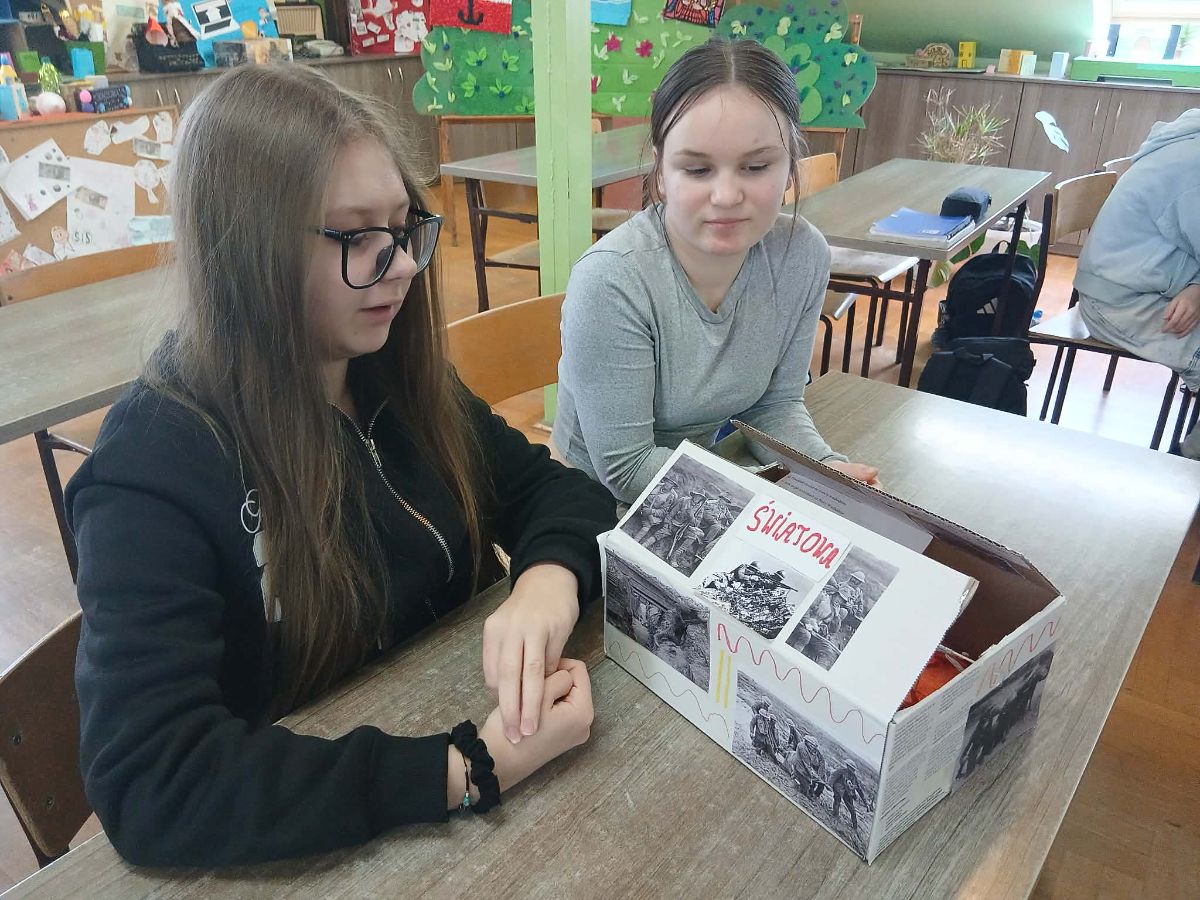 Gotowe pudełka zaprezentowano w klasie – była to świetna okazja, by zobaczyć historię z bliska… dosłownie zamkniętą w pudełku!