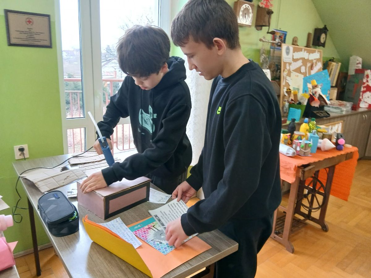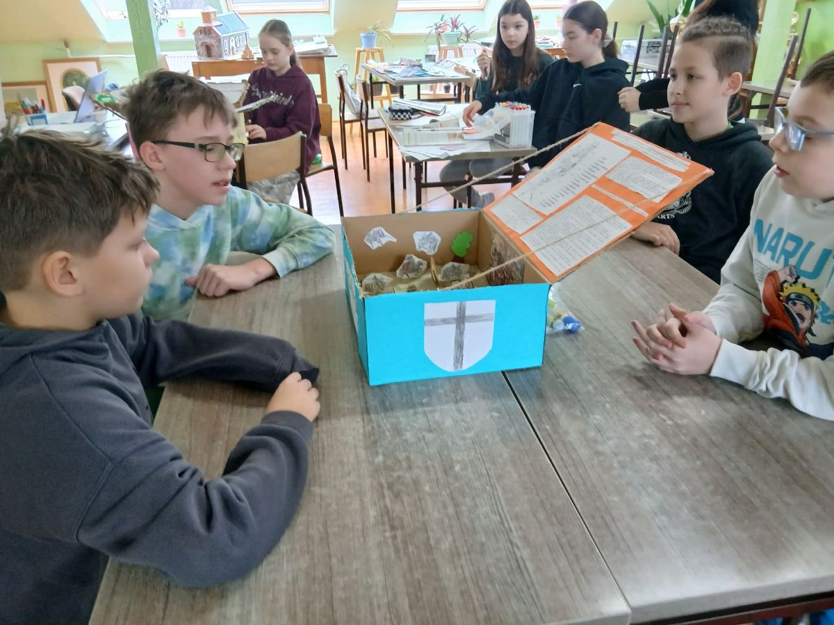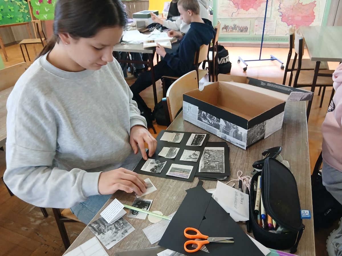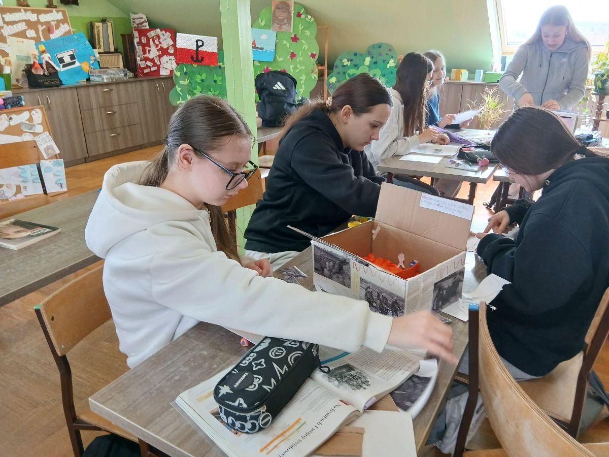 Uczniowie klas 5b i 7a stworzyli projekty „Historia w pudełku” – czyli małe scenki przedstawiające wydarzenia, postacie lub epoki historyczne. W pudełkach pojawiły się ilustracje, opisy, symbole i różne modele (czasem tak szczegółowe, że prawie brakowało tylko wehikułu czasu ).