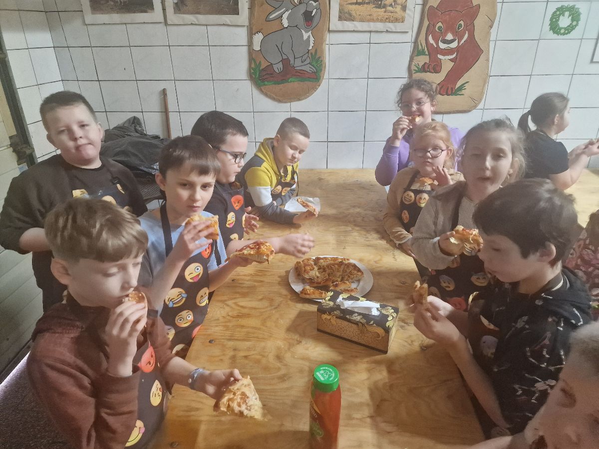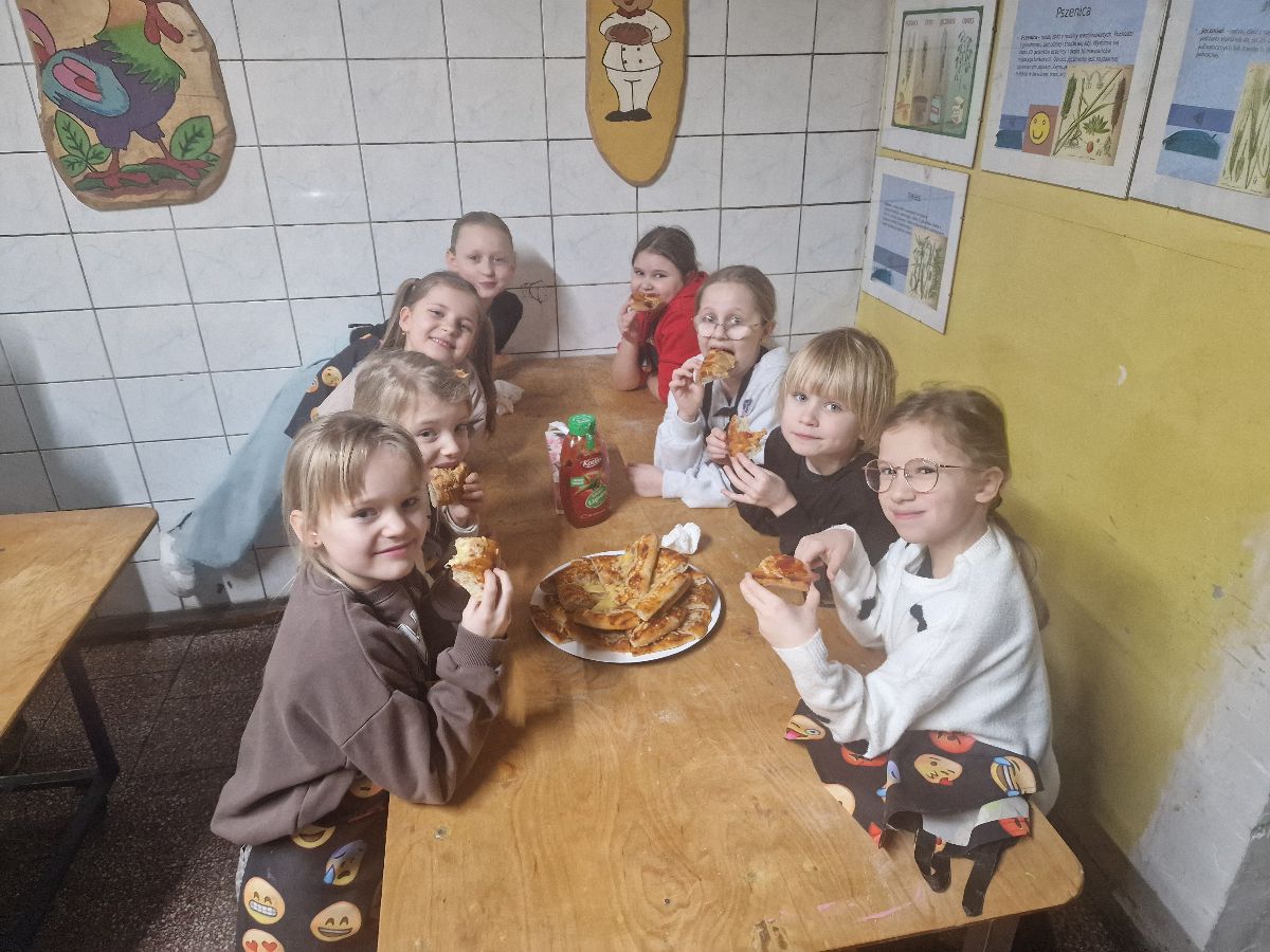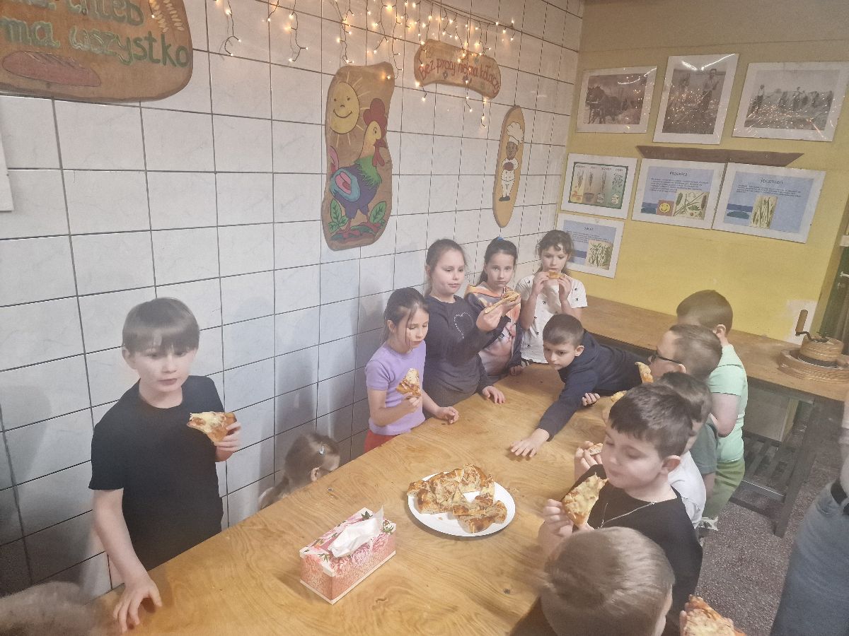 Na zakończenie warsztatów czekała na wszystkich miła niespodzianka – ciepła, pyszna pizza przygotowana przez szefową piekarni, która smakowała wyjątkowo po tak pracowitej wizycie.