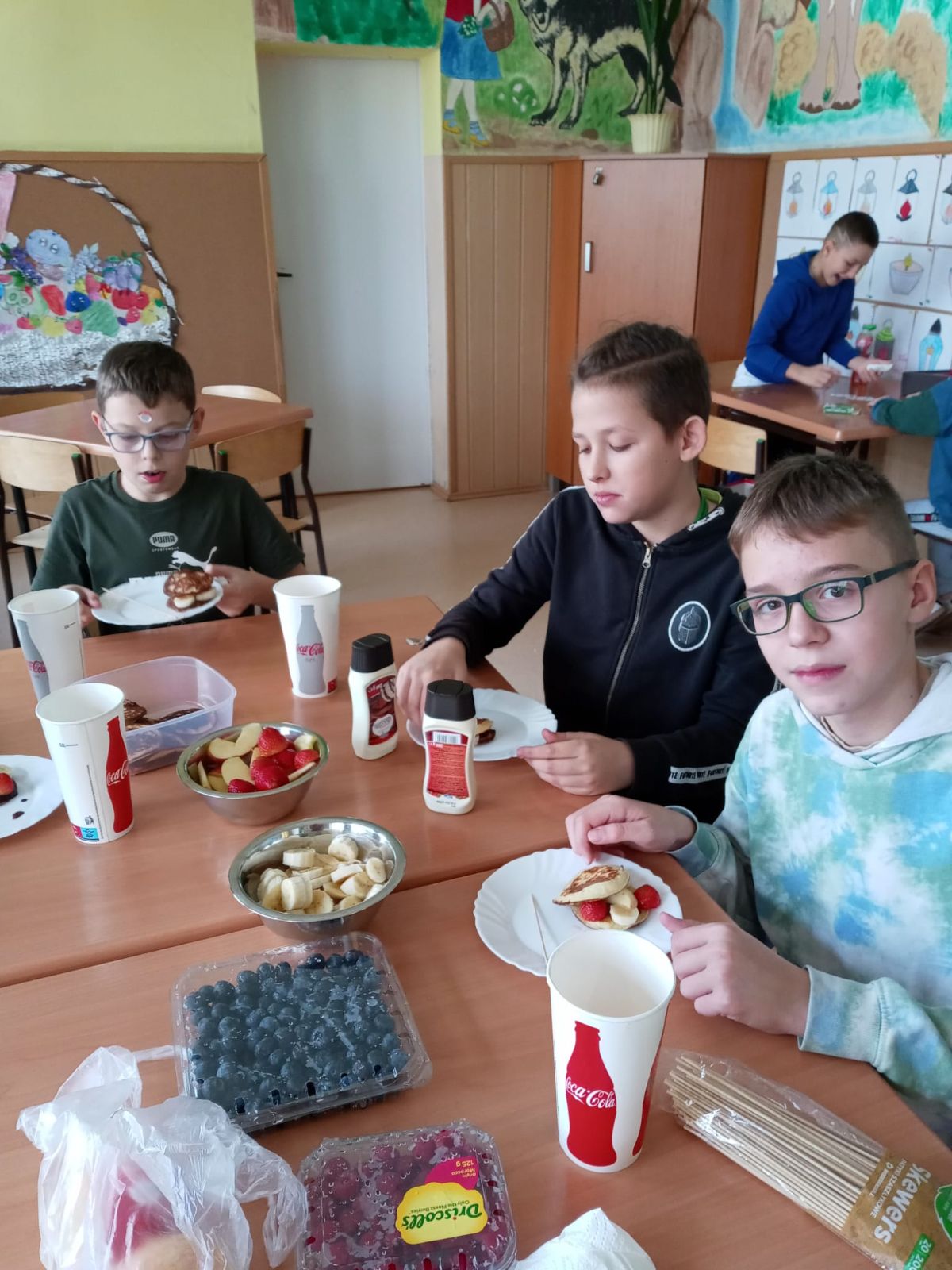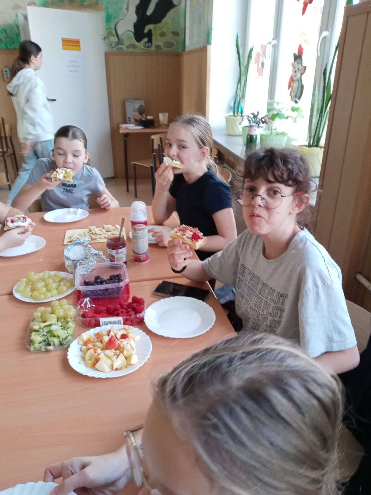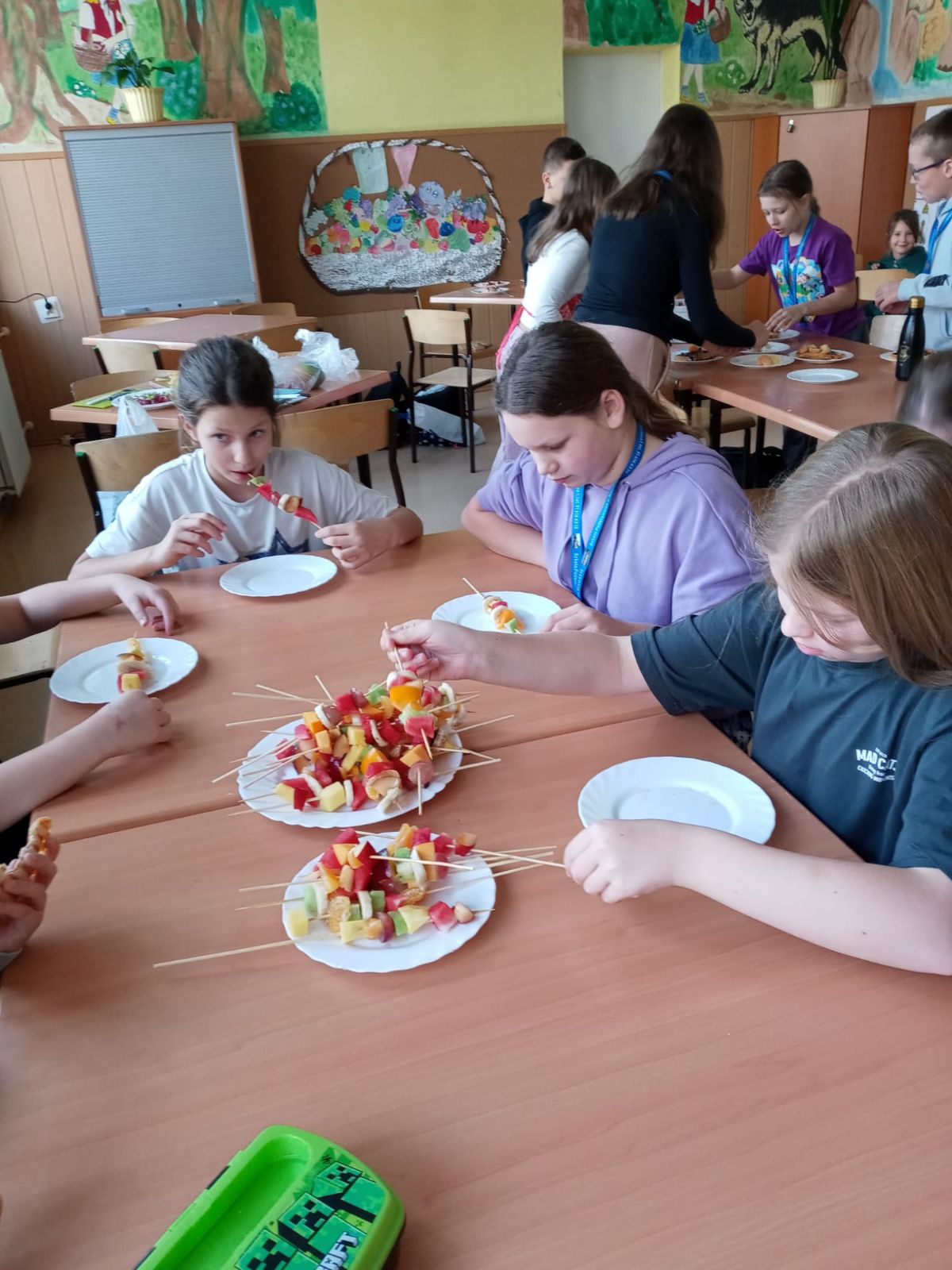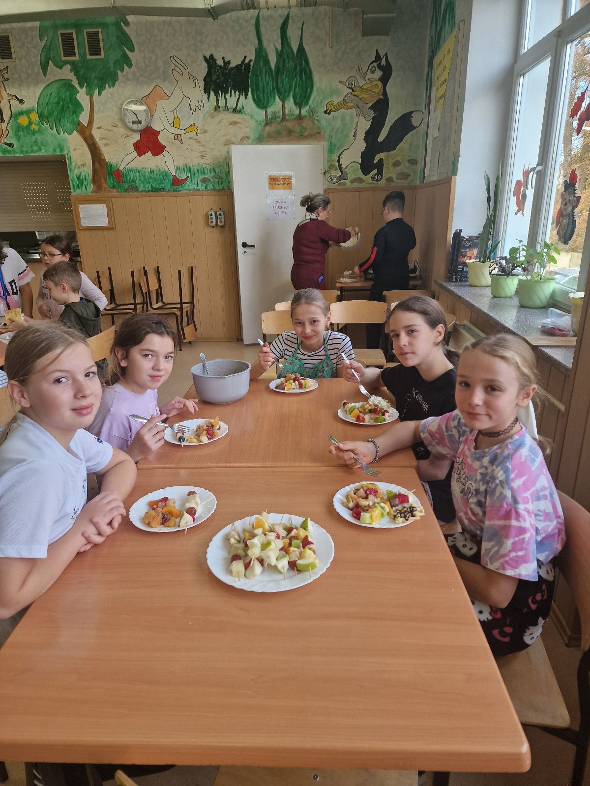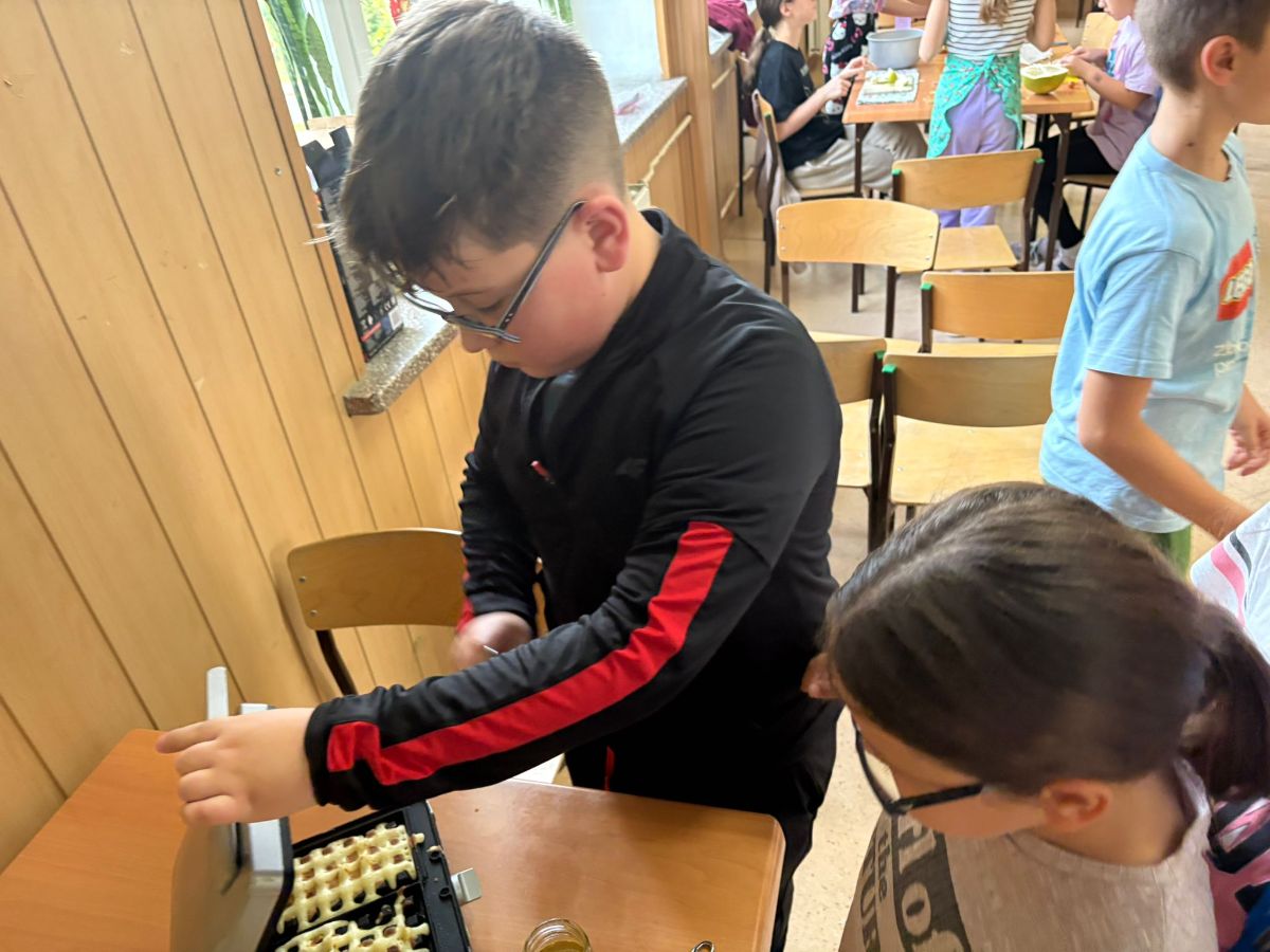 Nasza szkoła bierze udział w „Programie dla szkół” organizowanym przez KOWR. W ramach tego programu uczniowie klas IV i V na świetlicy szkolnej w grupach przygotowywali zdrowe posiłki: sałatki, gofry z owocami, koreczki z owoców – warsztaty kulinarne. Wszyscy brali czynny udział i pomagali sobie wzajemnie. Posiłki wykonywali według zasad bezpieczeństwa. Przestrzegali zasad higieny, przygotowując pyszne jedzonko. Praca przebiegała w miłej i sympatycznej atmosferze. Nie brakowało też śmiechu i humoru. Po skończonej pracy uczniowie częstowali nauczycieli i siebie nawzajem, życząc SMACZNEGO.