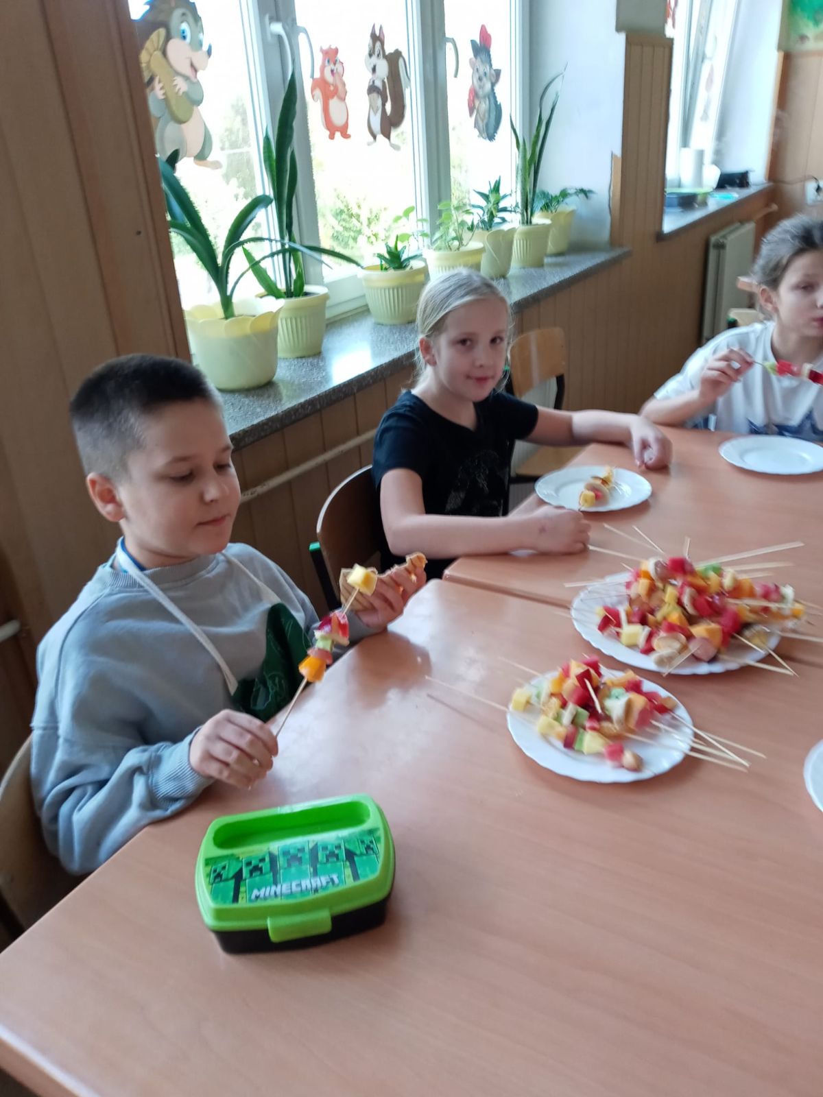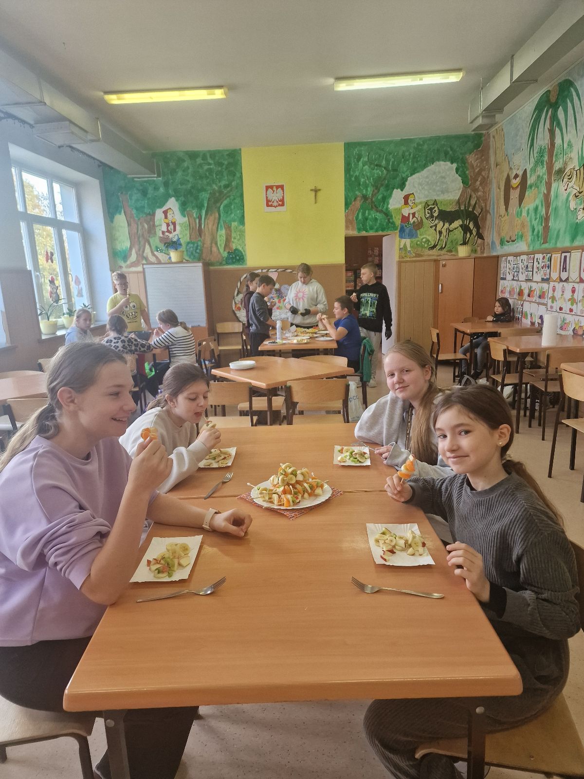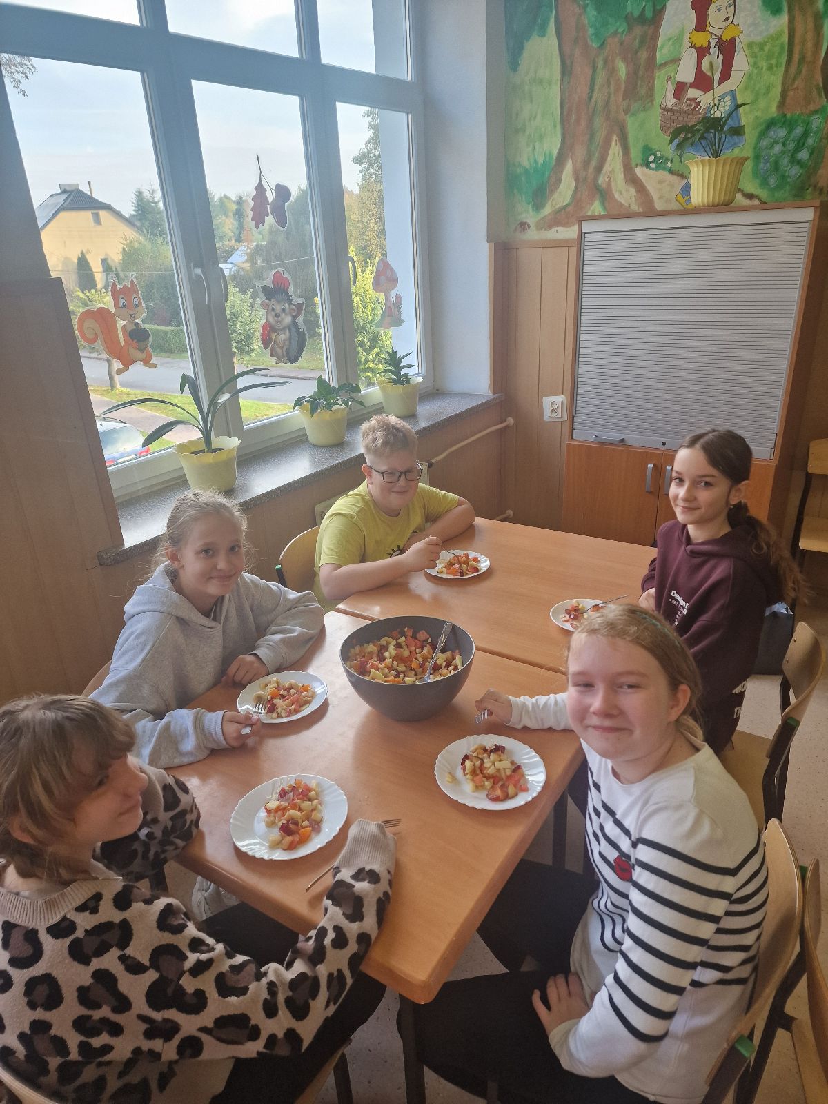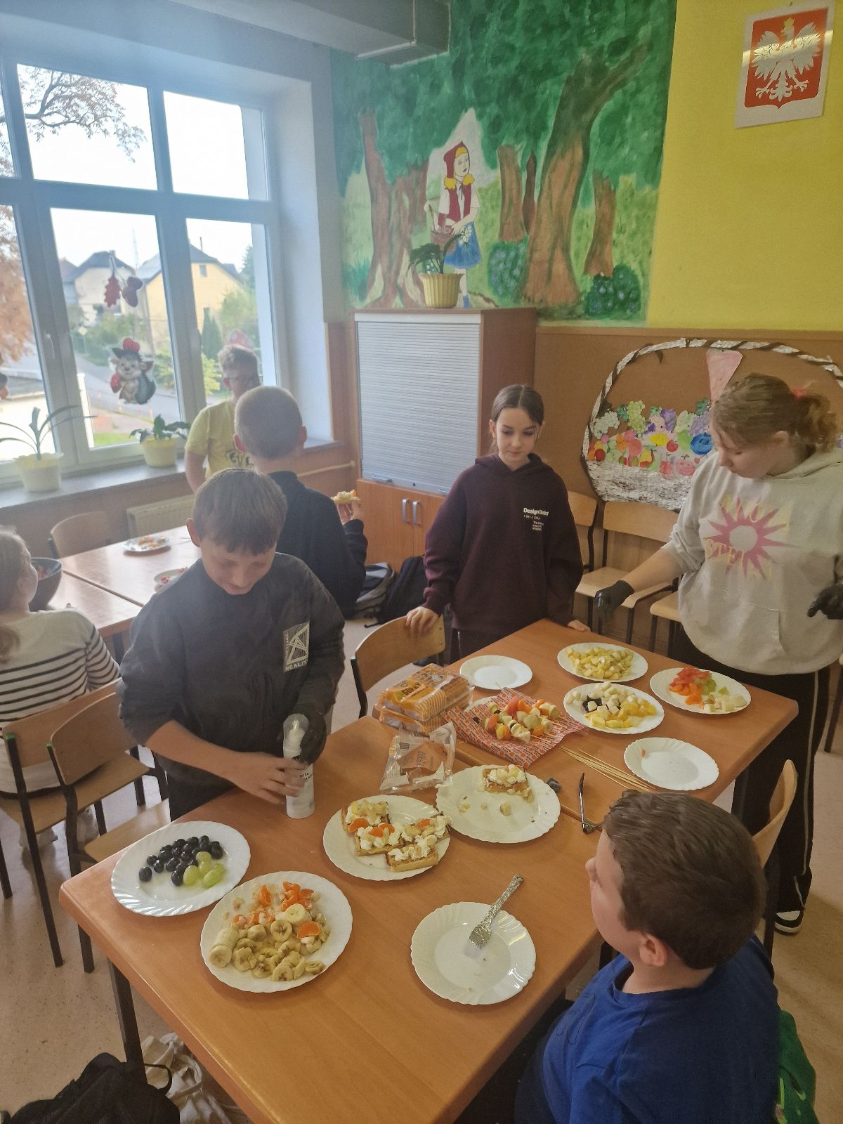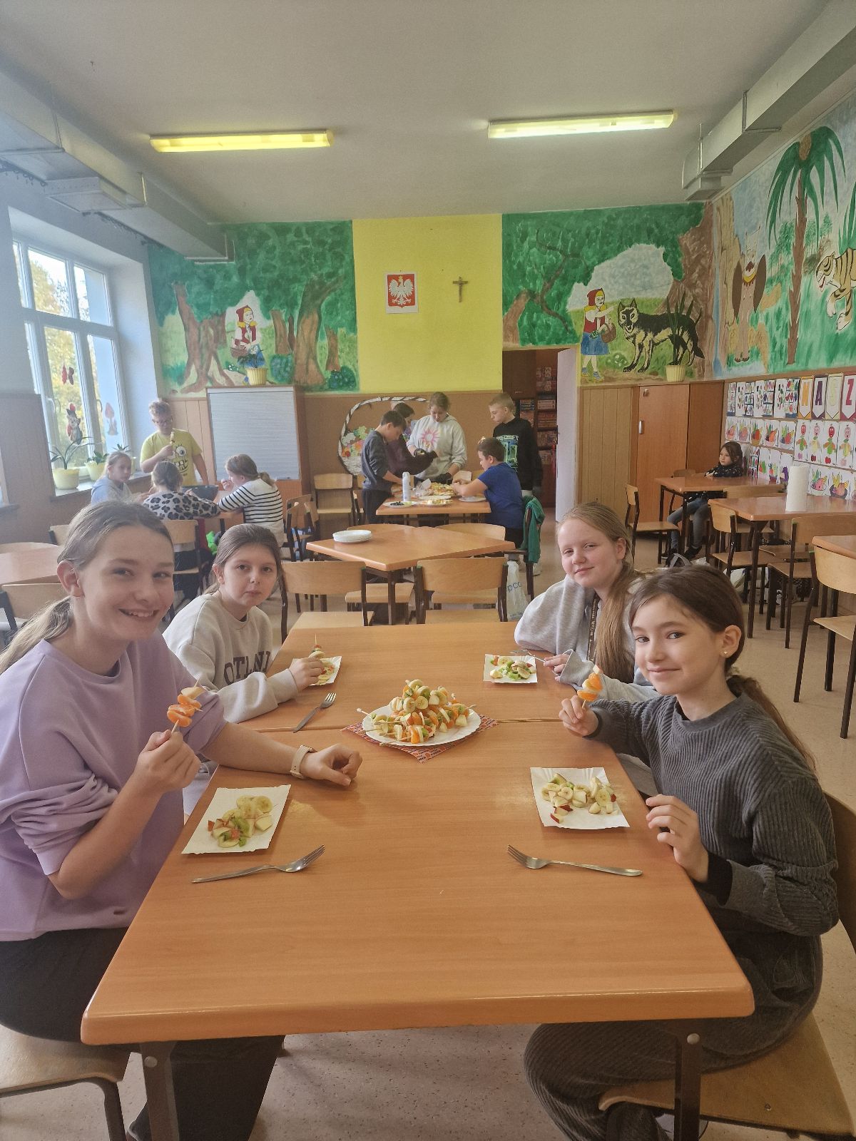 Nasza szkoła bierze udział w „Programie dla szkół” organizowanym przez KOWR. W ramach tego programu uczniowie klas IV i V na świetlicy szkolnej w grupach przygotowywali zdrowe posiłki: sałatki, gofry z owocami, koreczki z owoców – warsztaty kulinarne. Wszyscy brali czynny udział i pomagali sobie wzajemnie. Posiłki wykonywali według zasad bezpieczeństwa. Przestrzegali zasad higieny, przygotowując pyszne jedzonko. Praca przebiegała w miłej i sympatycznej atmosferze. Nie brakowało też śmiechu i humoru. Po skończonej pracy uczniowie częstowali nauczycieli i siebie nawzajem, życząc SMACZNEGO.