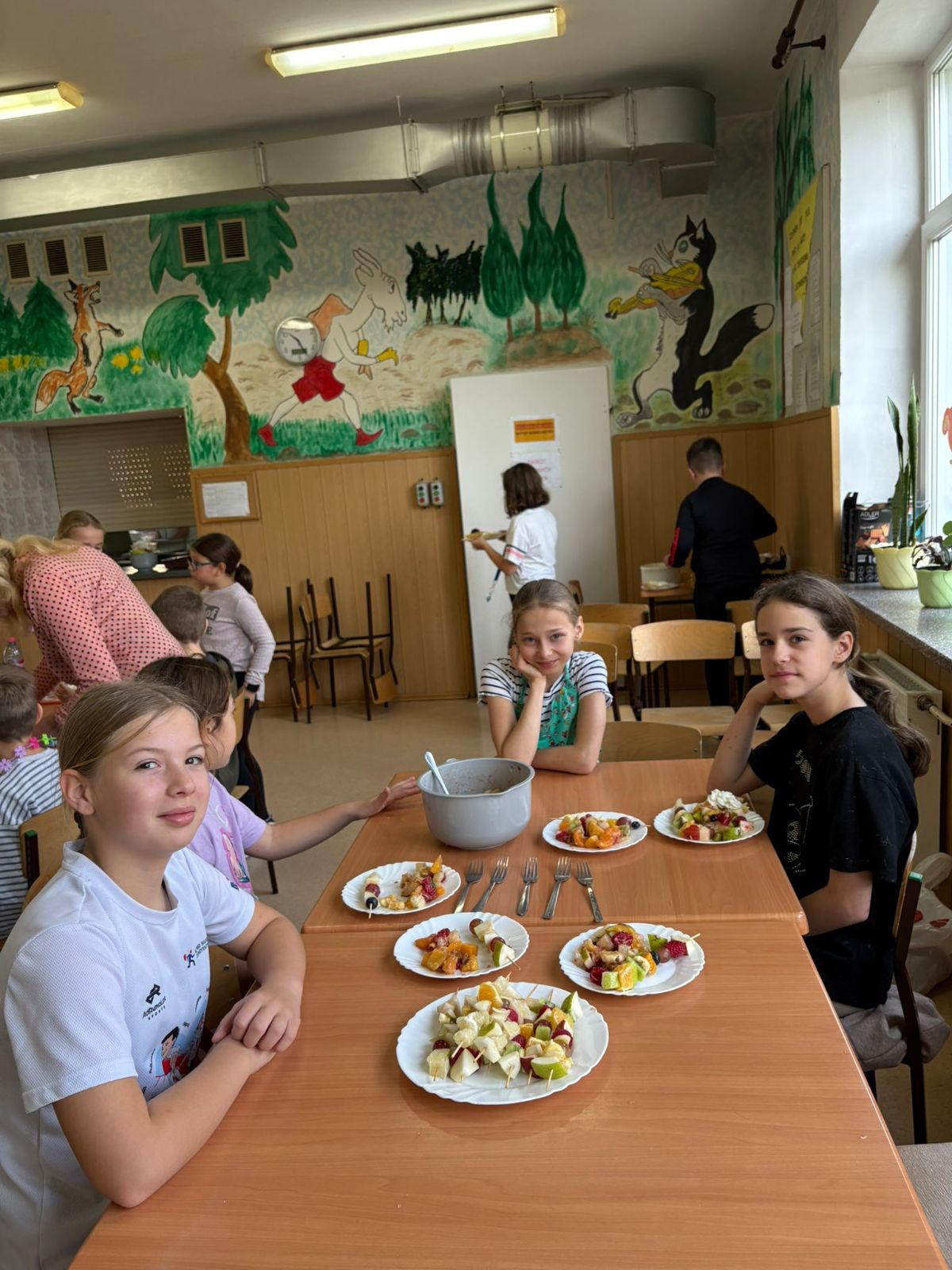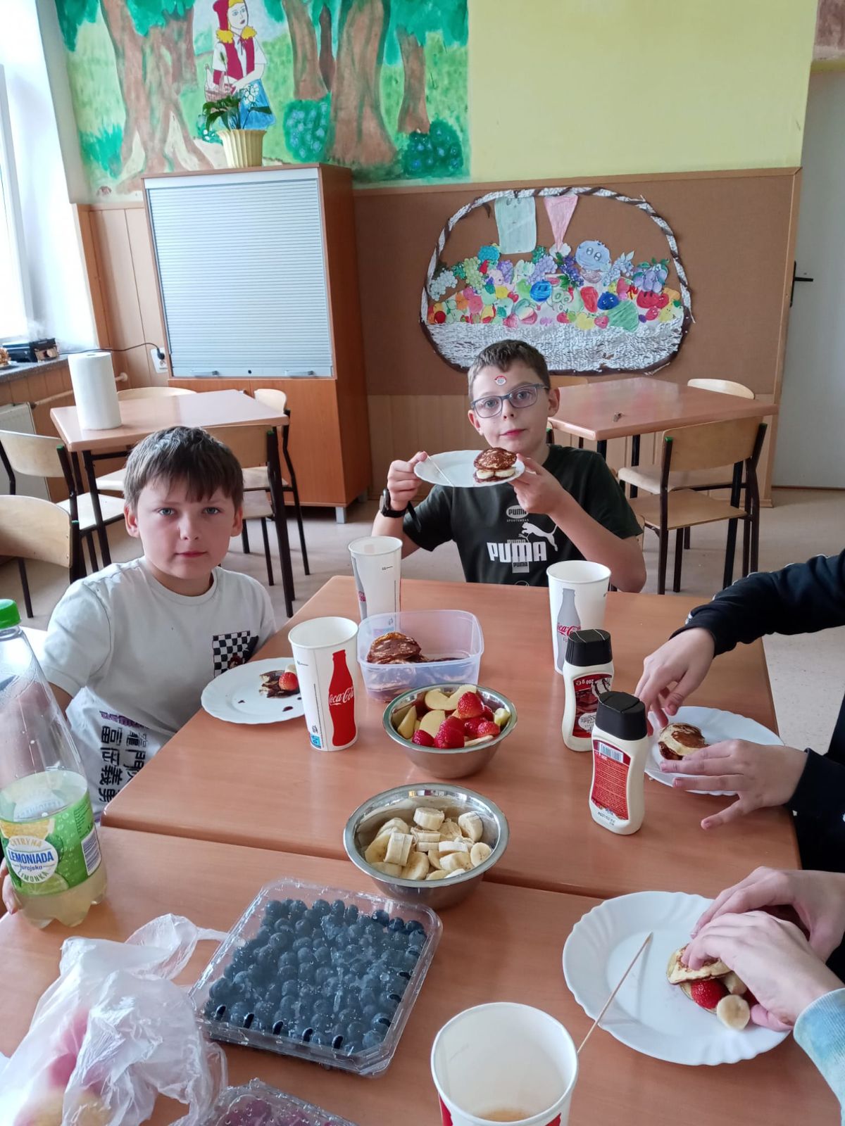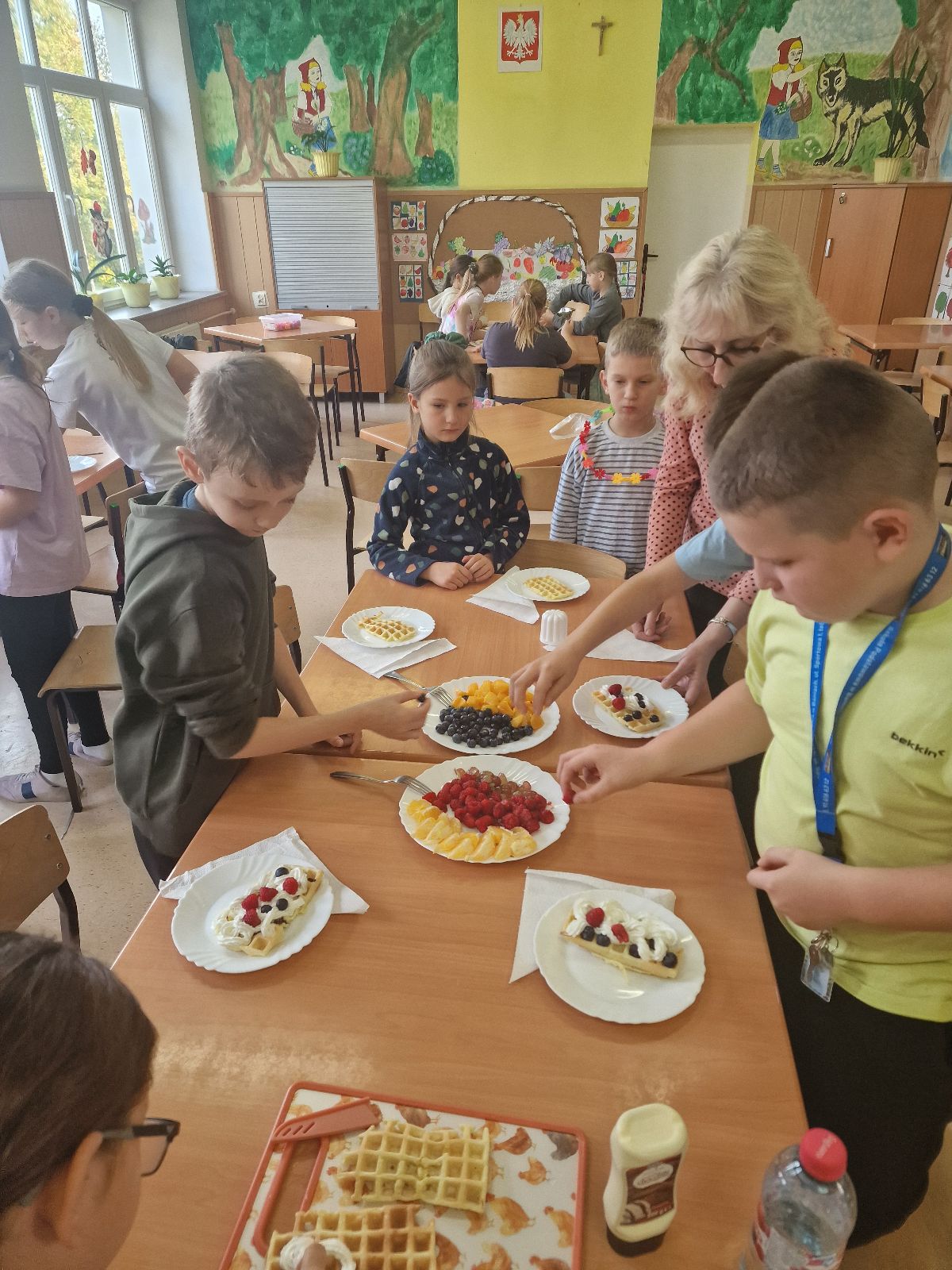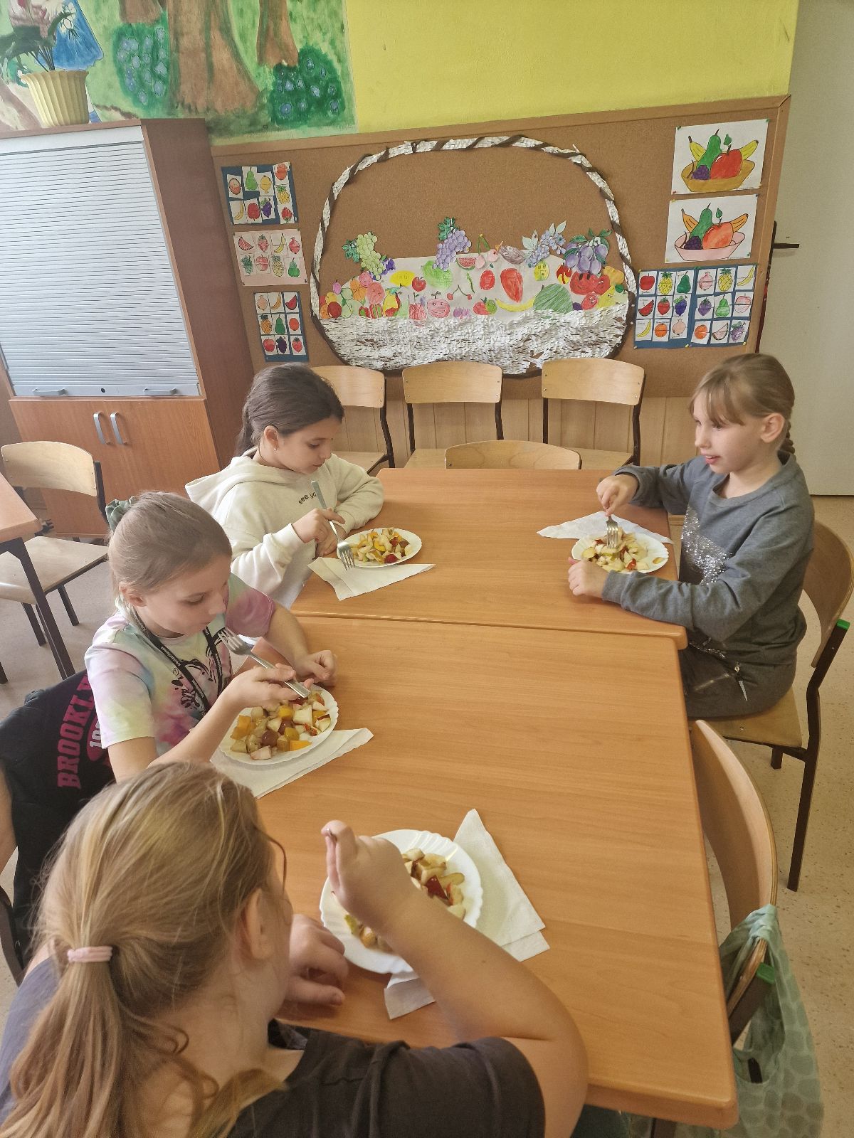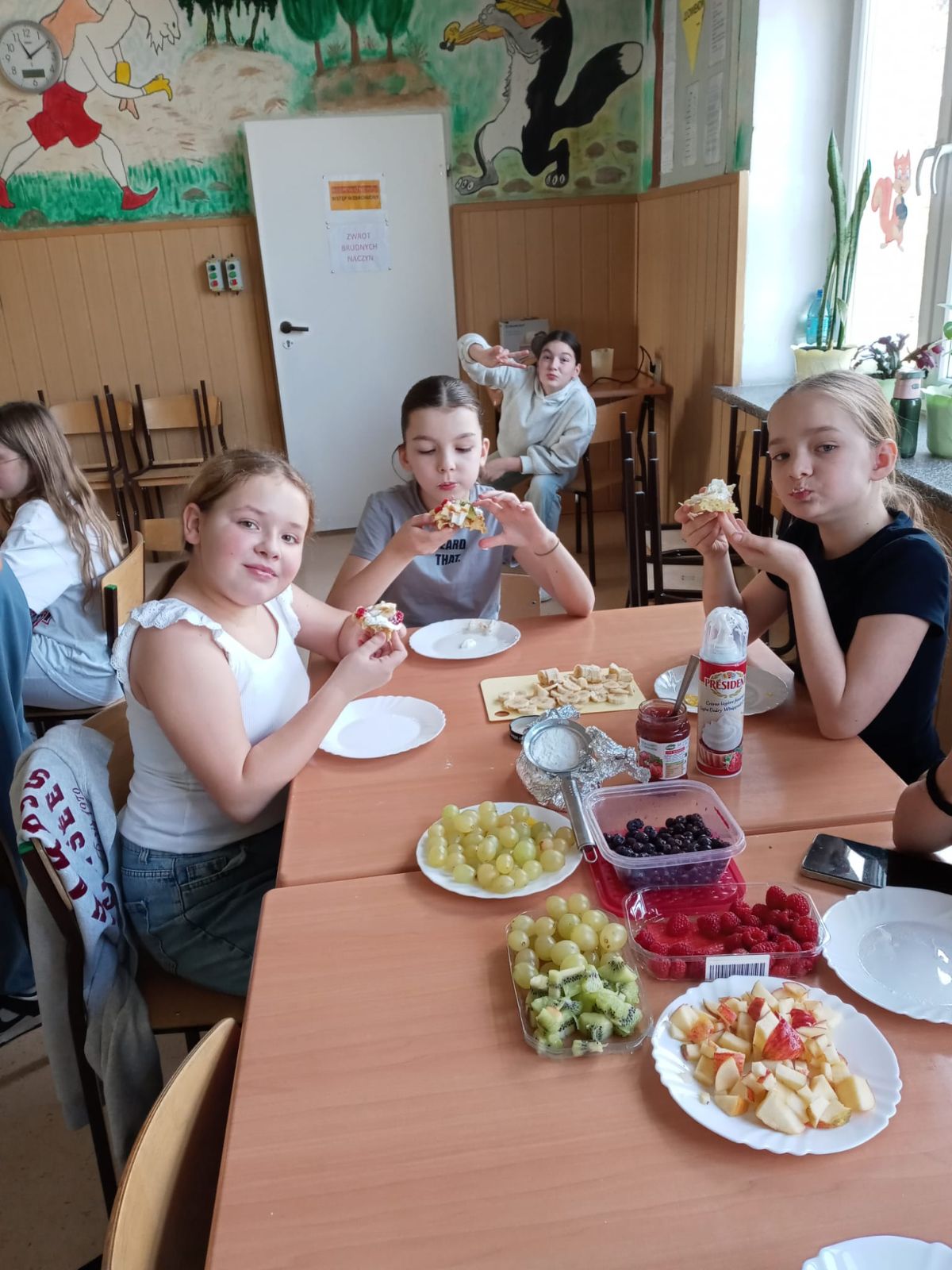 Nasza szkoła bierze udział w „Programie dla szkół” organizowanym przez KOWR. W ramach tego programu uczniowie klas IV i V na świetlicy szkolnej w grupach przygotowywali zdrowe posiłki: sałatki, gofry z owocami, koreczki z owoców – warsztaty kulinarne. Wszyscy brali czynny udział i pomagali sobie wzajemnie. Posiłki wykonywali według zasad bezpieczeństwa. Przestrzegali zasad higieny, przygotowując pyszne jedzonko. Praca przebiegała w miłej i sympatycznej atmosferze. Nie brakowało też śmiechu i humoru. Po skończonej pracy uczniowie częstowali nauczycieli i siebie nawzajem, życząc SMACZNEGO.
