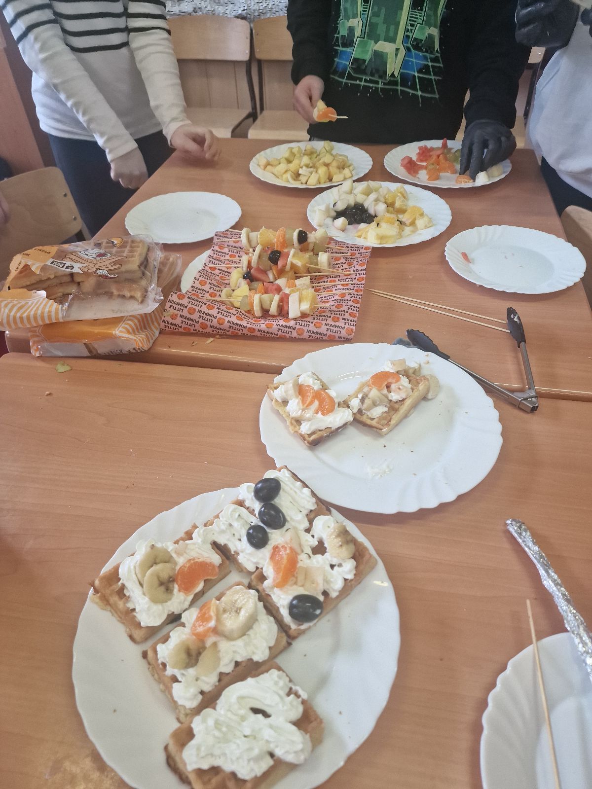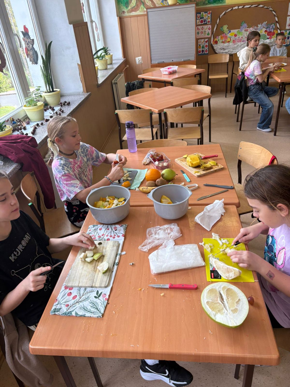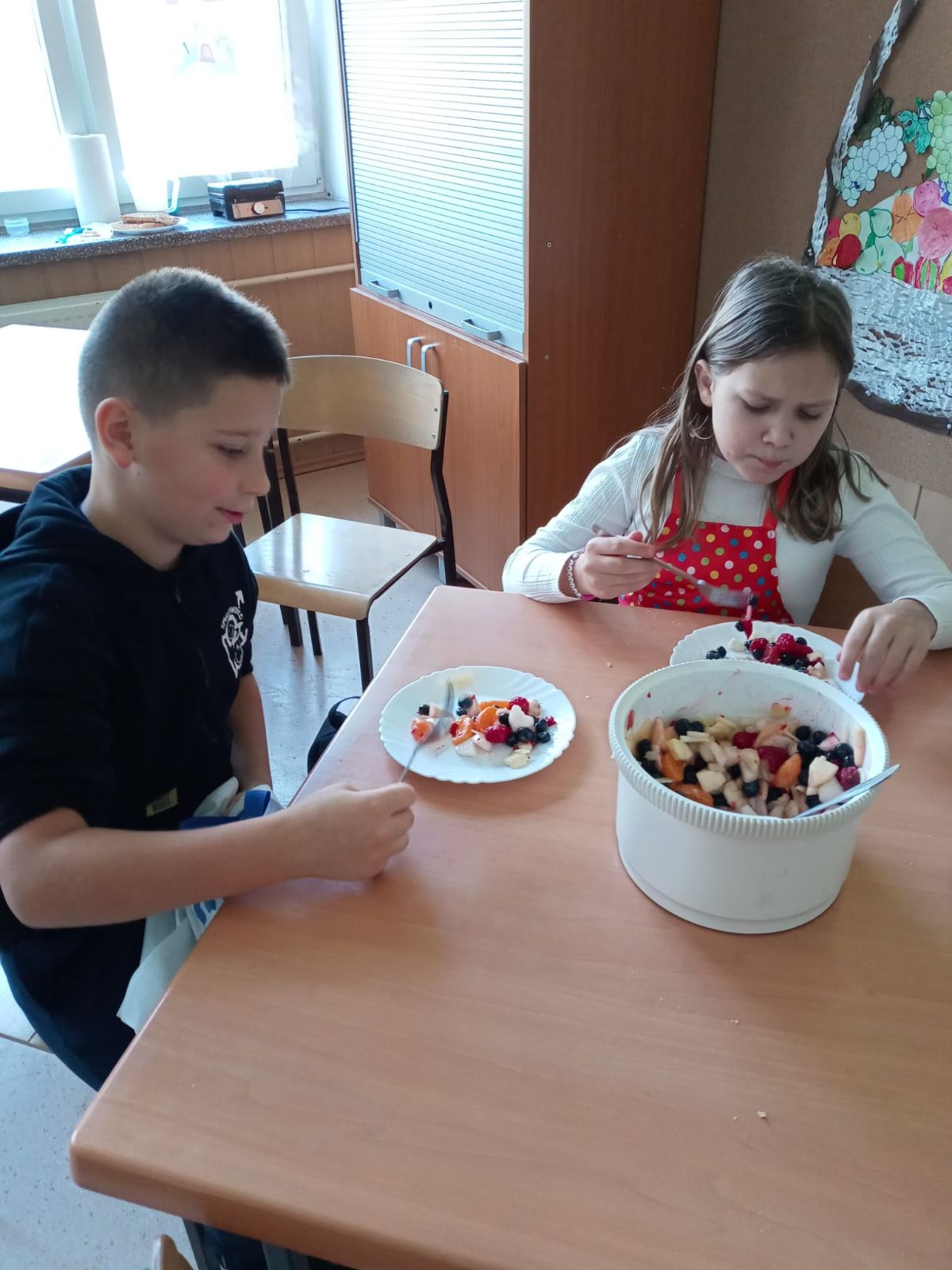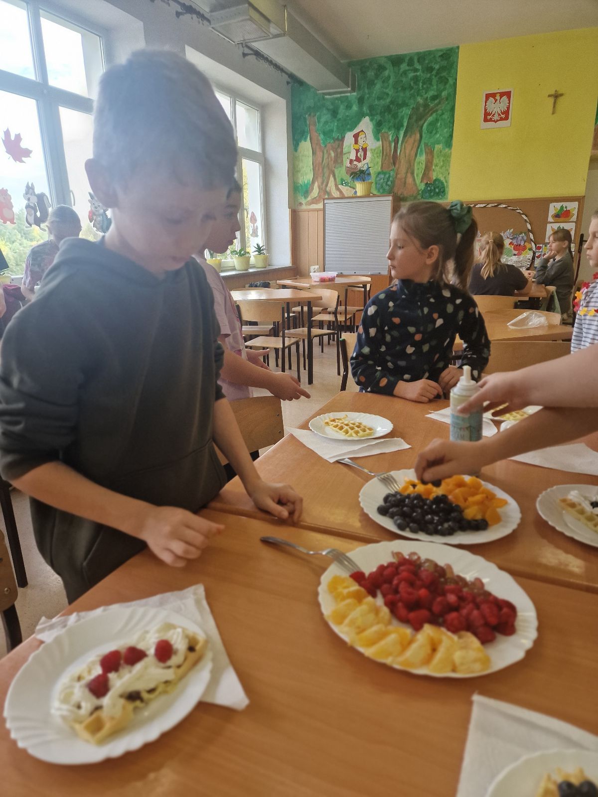 Nasza szkoła bierze udział w „Programie dla szkół” organizowanym przez KOWR. W ramach tego programu uczniowie klas IV i V na świetlicy szkolnej w grupach przygotowywali zdrowe posiłki: sałatki, gofry z owocami, koreczki z owoców – warsztaty kulinarne. Wszyscy brali czynny udział i pomagali sobie wzajemnie. Posiłki wykonywali według zasad bezpieczeństwa. Przestrzegali zasad higieny, przygotowując pyszne jedzonko. Praca przebiegała w miłej i sympatycznej atmosferze. Nie brakowało też śmiechu i humoru. Po skończonej pracy uczniowie częstowali nauczycieli i siebie nawzajem, życząc SMACZNEGO.