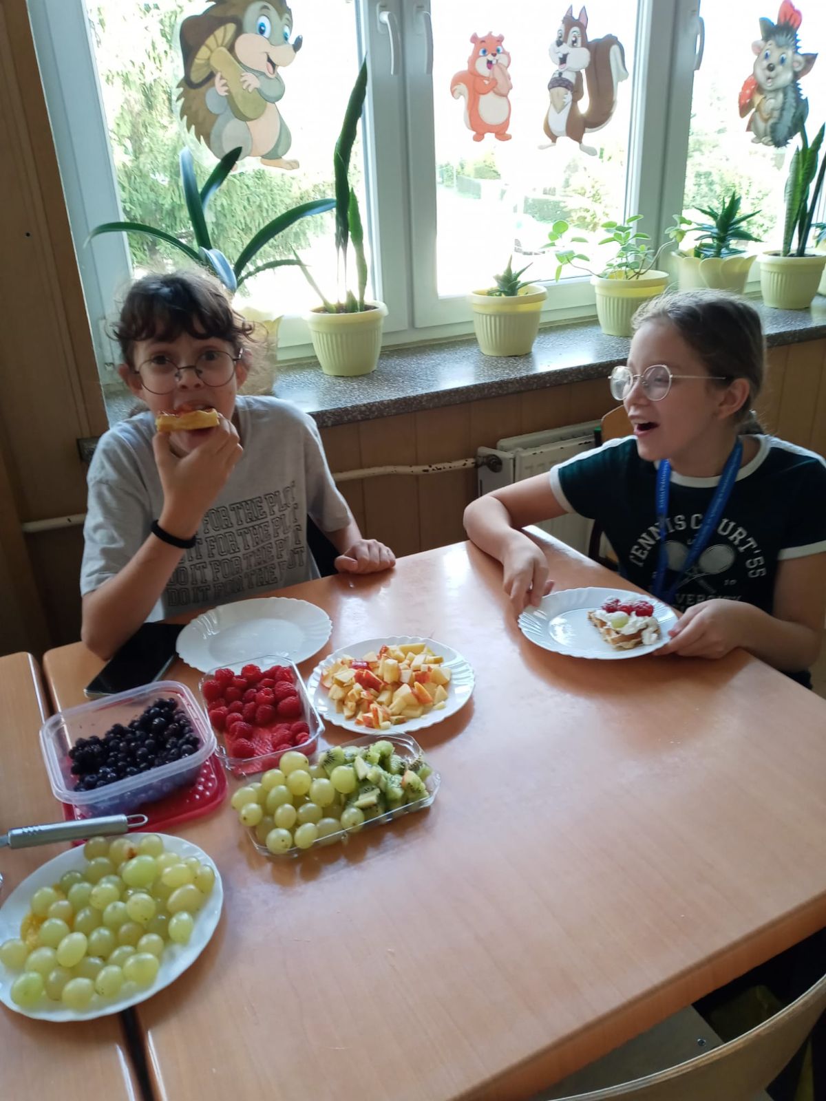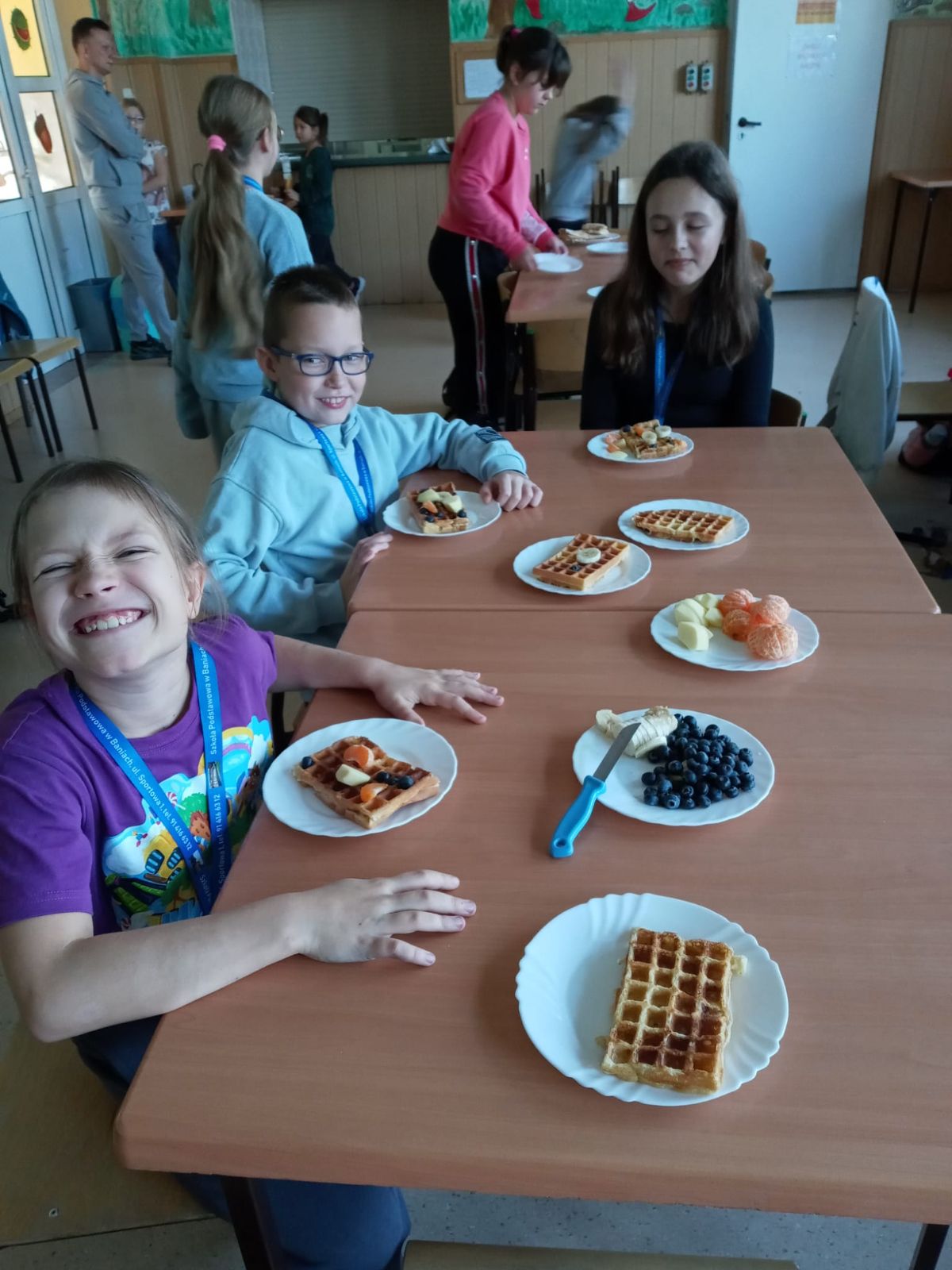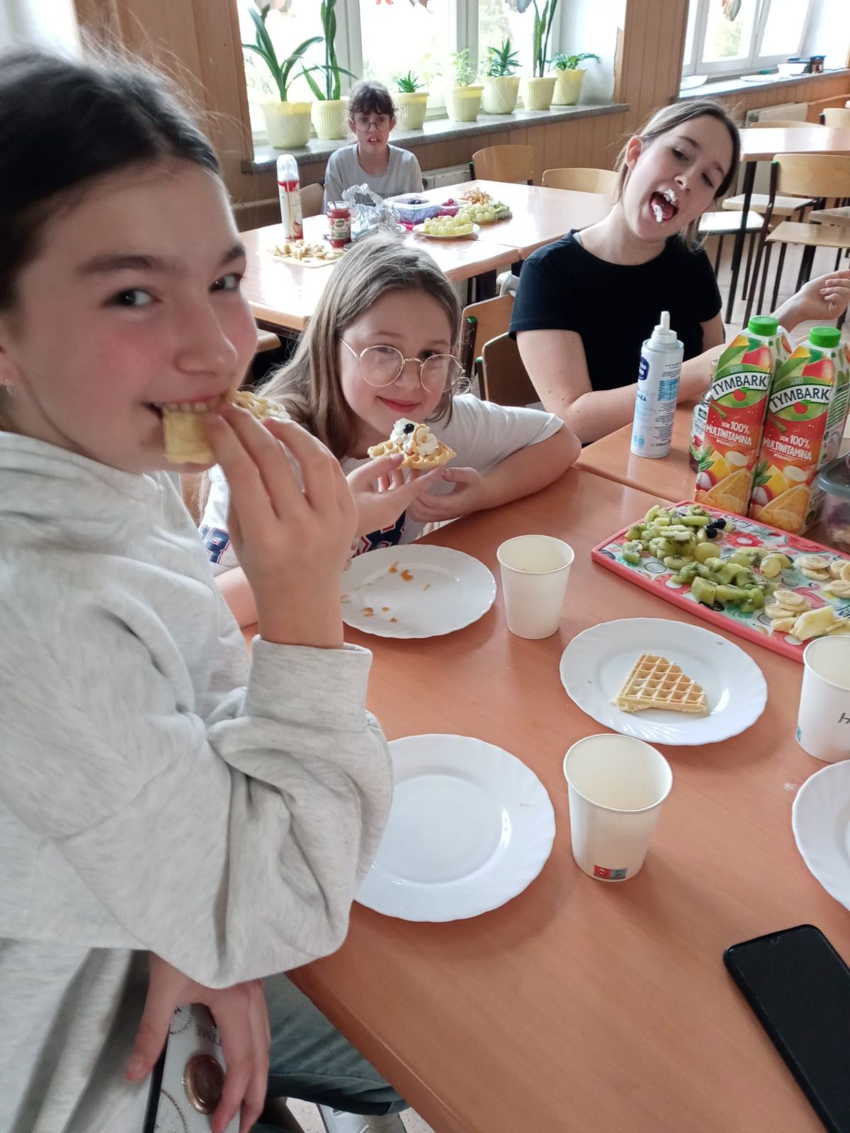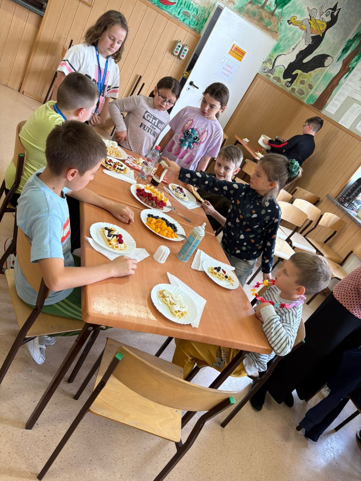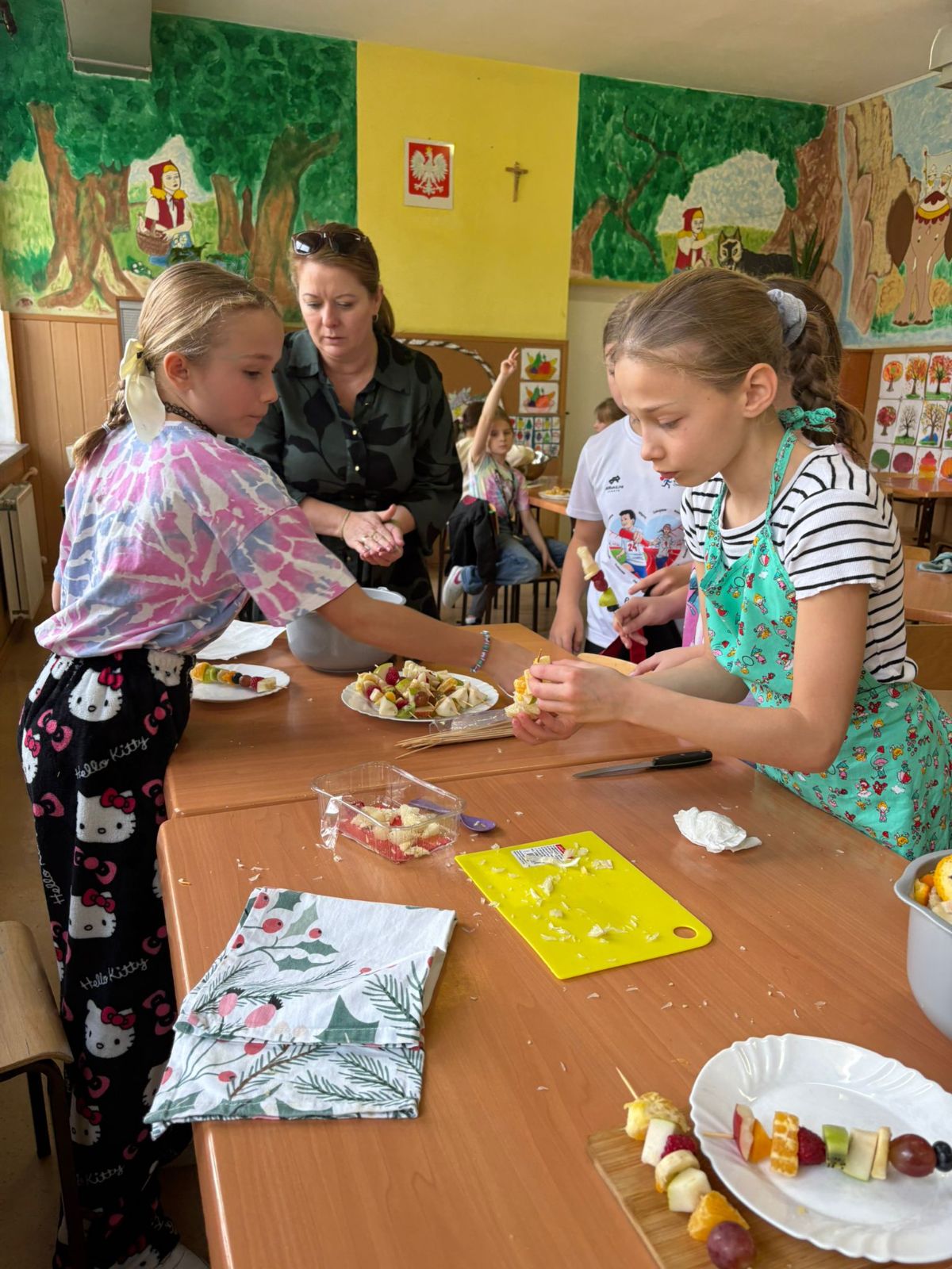 Nasza szkoła bierze udział w „Programie dla szkół” organizowanym przez KOWR. W ramach tego programu uczniowie klas IV i V na świetlicy szkolnej w grupach przygotowywali zdrowe posiłki: sałatki, gofry z owocami, koreczki z owoców – warsztaty kulinarne. Wszyscy brali czynny udział i pomagali sobie wzajemnie. Posiłki wykonywali według zasad bezpieczeństwa. Przestrzegali zasad higieny, przygotowując pyszne jedzonko. Praca przebiegała w miłej i sympatycznej atmosferze. Nie brakowało też śmiechu i humoru. Po skończonej pracy uczniowie częstowali nauczycieli i siebie nawzajem, życząc SMACZNEGO.