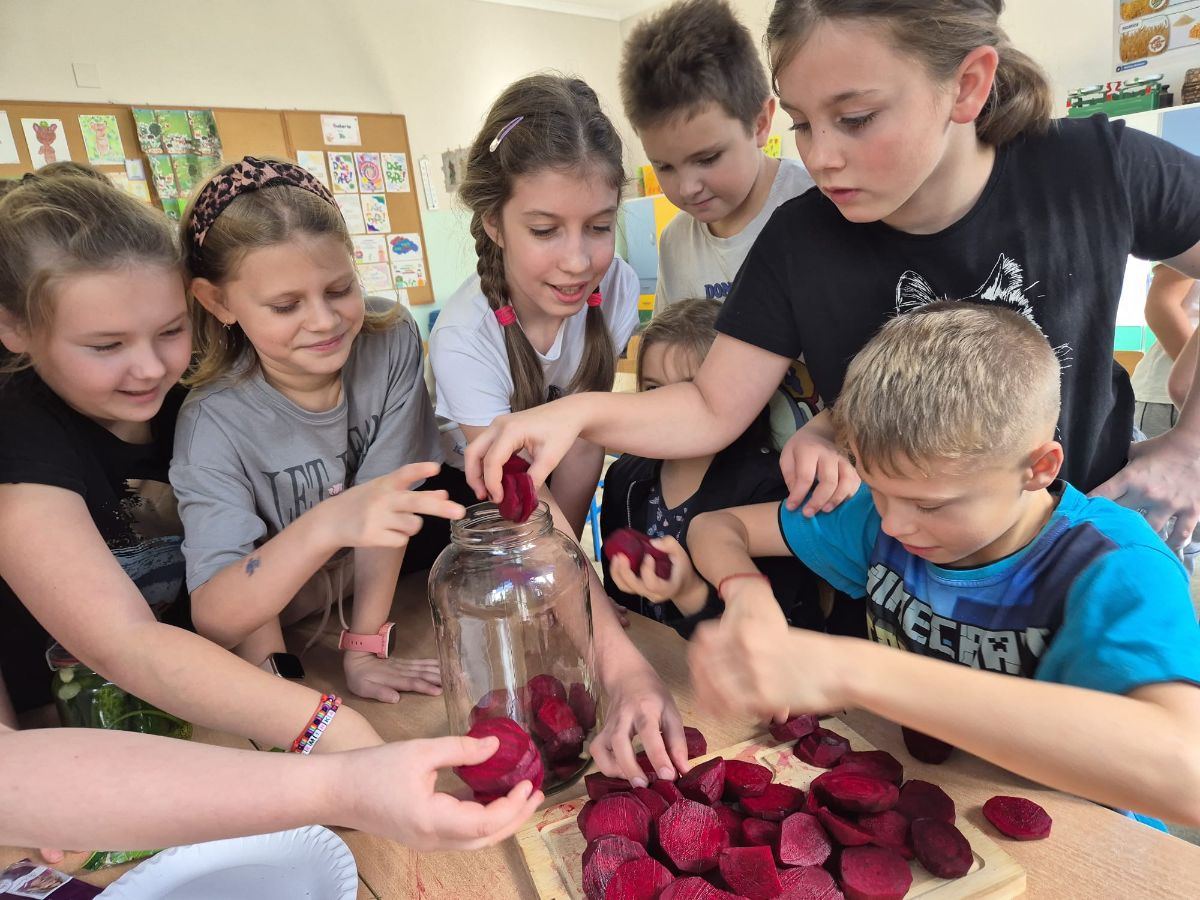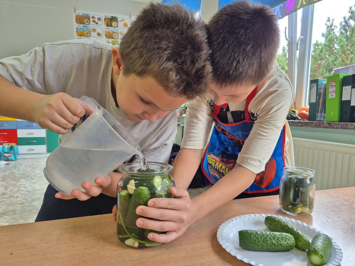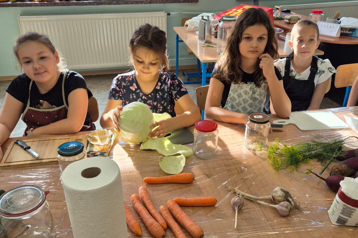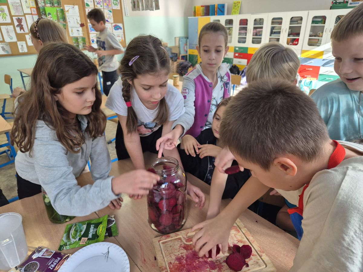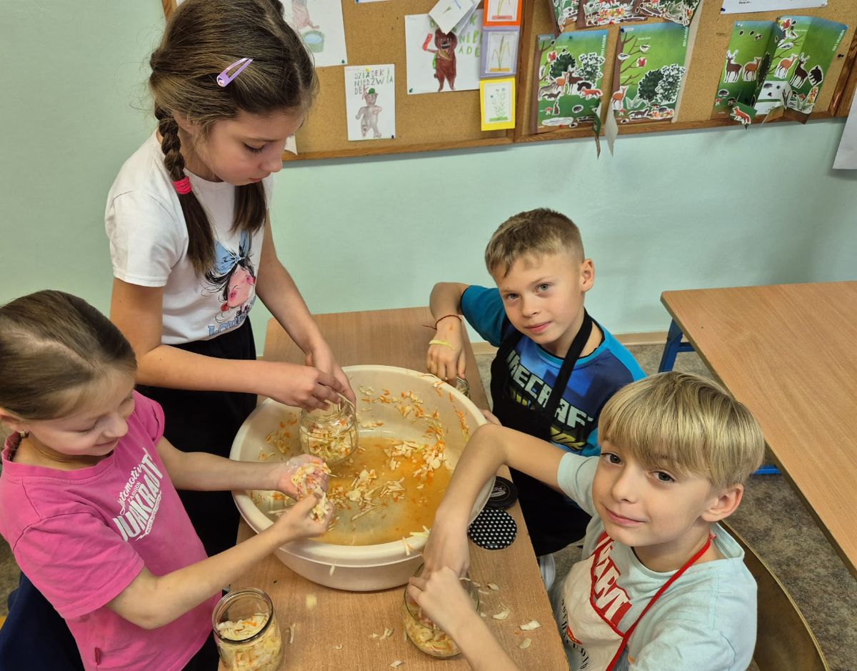 Uczniowie z klasy 3a postanowili sprawdzić, jak smakuje jesień zamknięta w słoiku. W ramach zajęć z edukacji przyrodniczej i technicznej własnoręcznie przygotowali kiszoną kapustę, ogórki oraz zakwas z buraka.