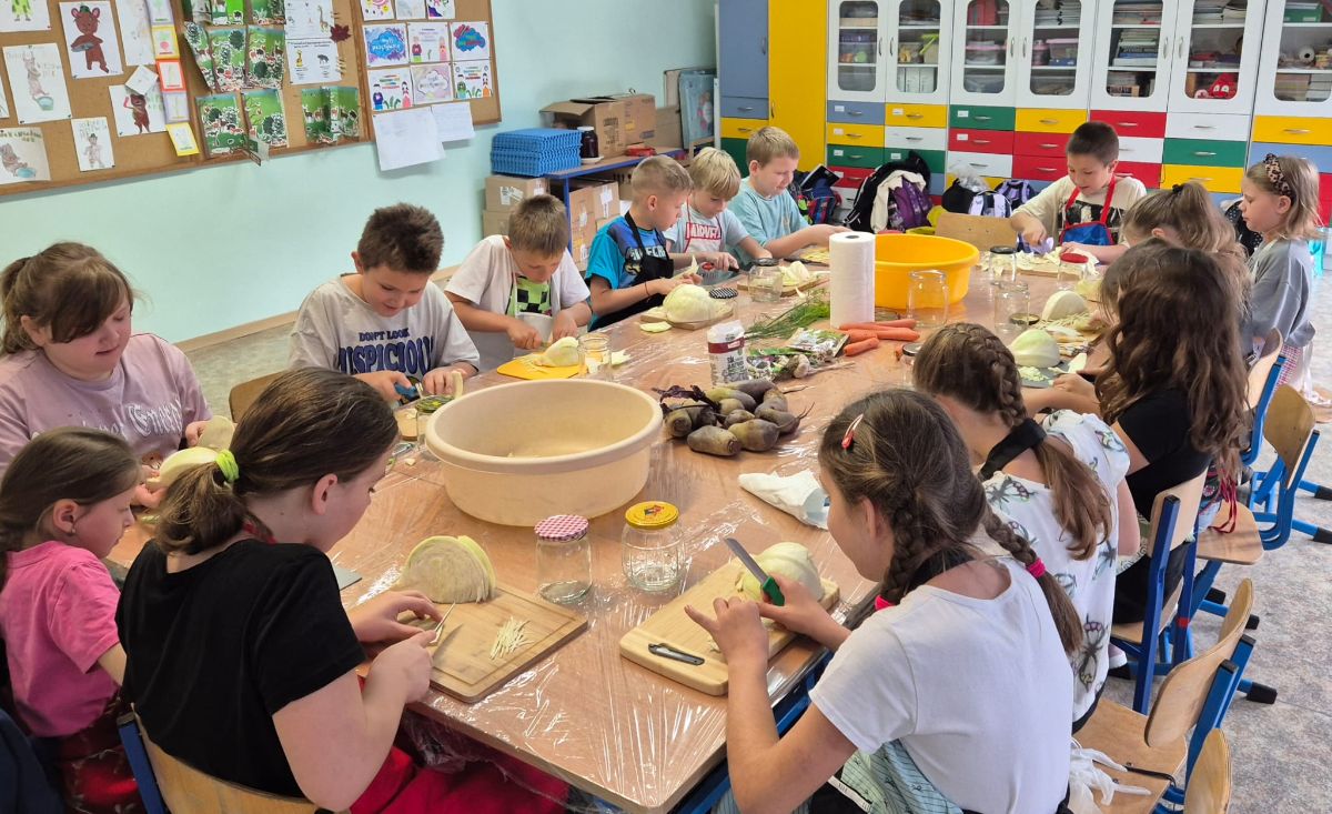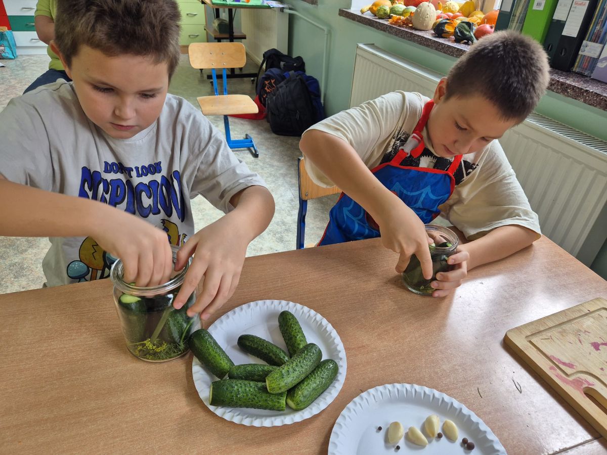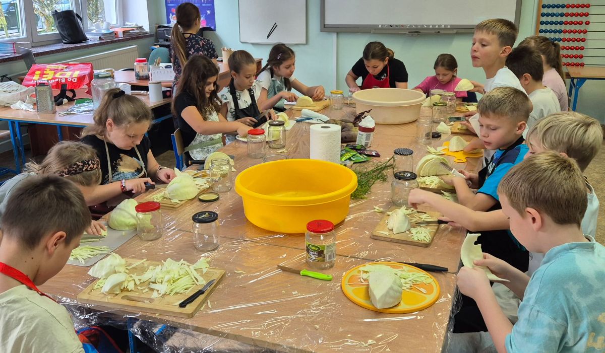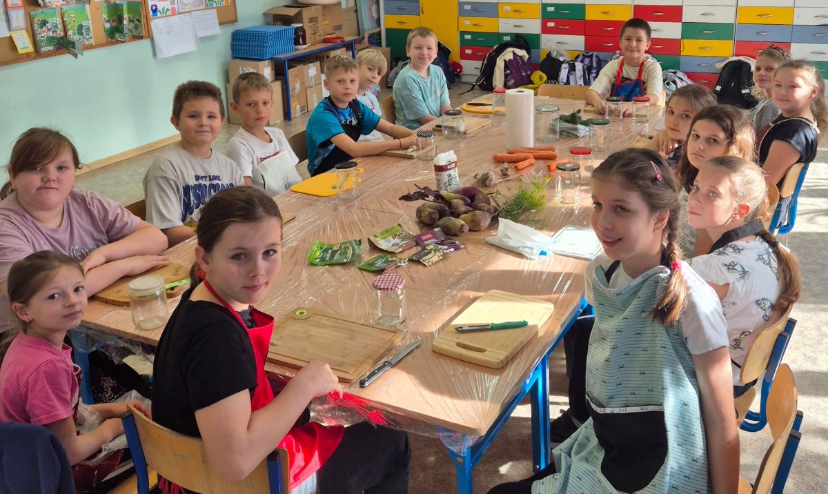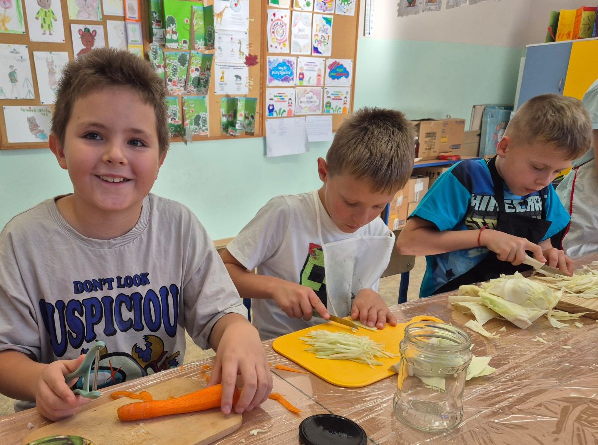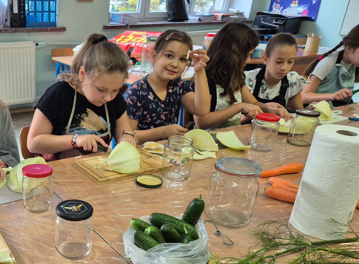 Uczniowie z klasy 3a postanowili sprawdzić, jak smakuje jesień zamknięta w słoiku. W ramach zajęć z edukacji przyrodniczej i technicznej własnoręcznie przygotowali kiszoną kapustę, ogórki oraz zakwas z buraka.